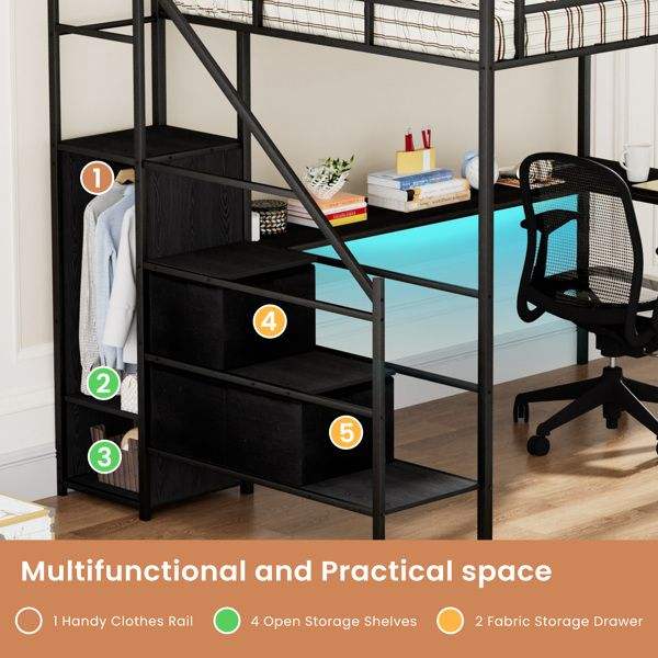 เตียงโลหะขนาดใหญ่พร้อมโต๊ะรูปตัวแอล ไฟ LED แท่นชาร์จ และตู้เก็บของ รุ่น WA
