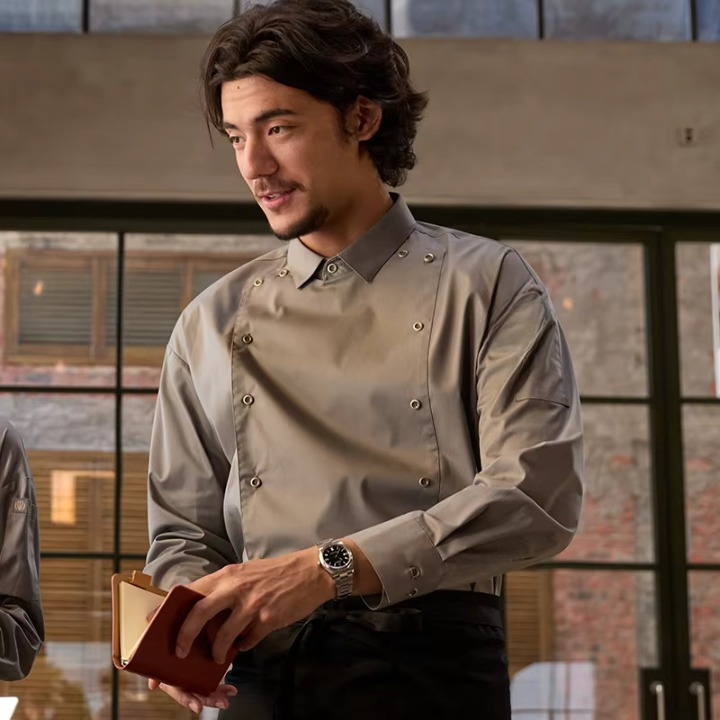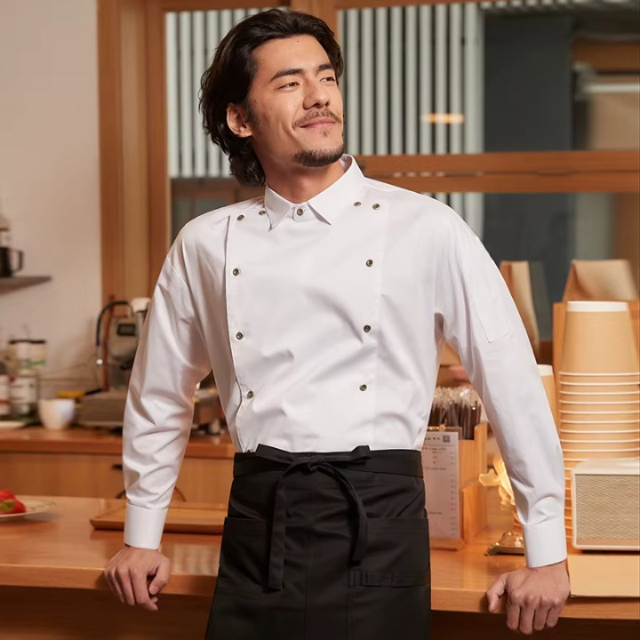 เสื้อแจ็กเก็ตการออกแบบมืออาชีพมีปกแขนเสื้อสำหรับพนักงานโรงแรมและเบเกอรี่เสื้อโค้ทเชฟคุณภาพระดับพรีเมียม