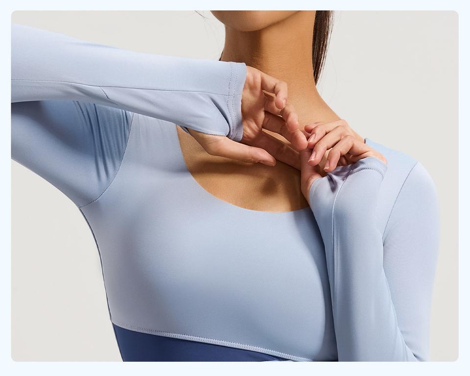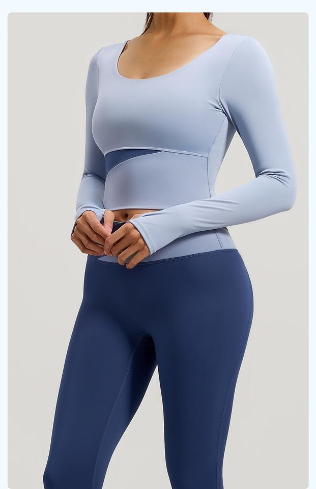 ชุดโยคะแขนยาวสีตัดต่อระบายอากาศได้ดี ทรงหลวม เหมาะสำหรับพิลาทิส ออกกำลังกาย วิ่ง และฟิตเนส พร้อมโลโก้ด้านหน้า