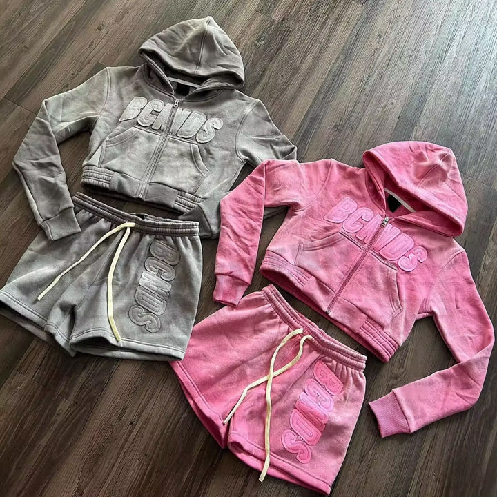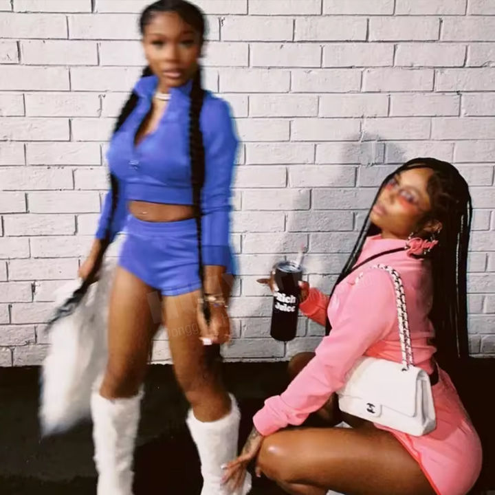 ชุดเซ็ตกำมะหยี่สองชิ้นสำหรับผู้หญิง ทรงปกติ เหมาะสำหรับฤดูร้อน เสื้อครอปแขนยาว มีกระเป๋าซิป