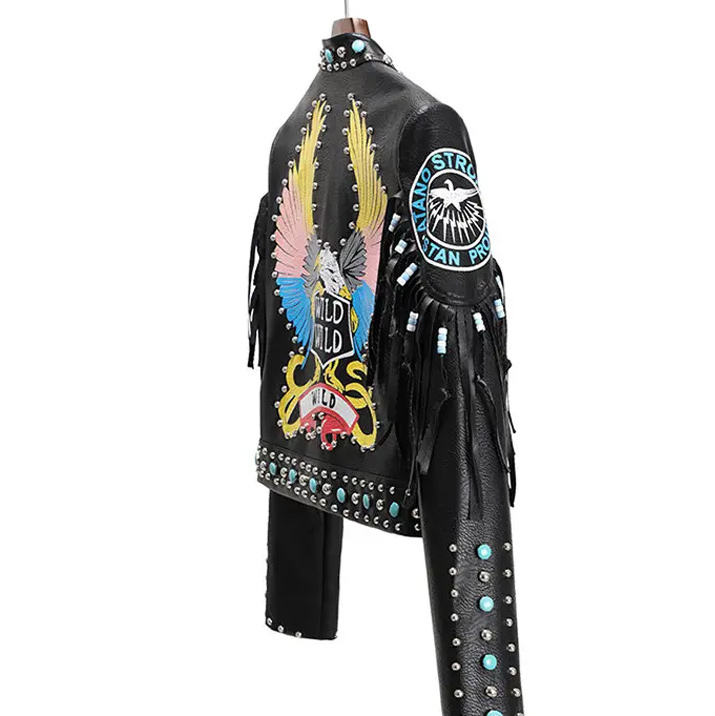 แจ็กเก็ตหนังวัวสีดำประดับด้วยหนังสไตล์พังก์แผ่นปักโลโก้ที่กำหนดเองสำหรับทุกเพศ