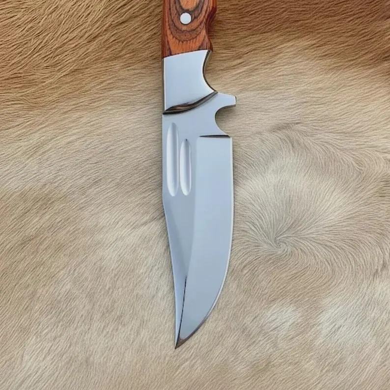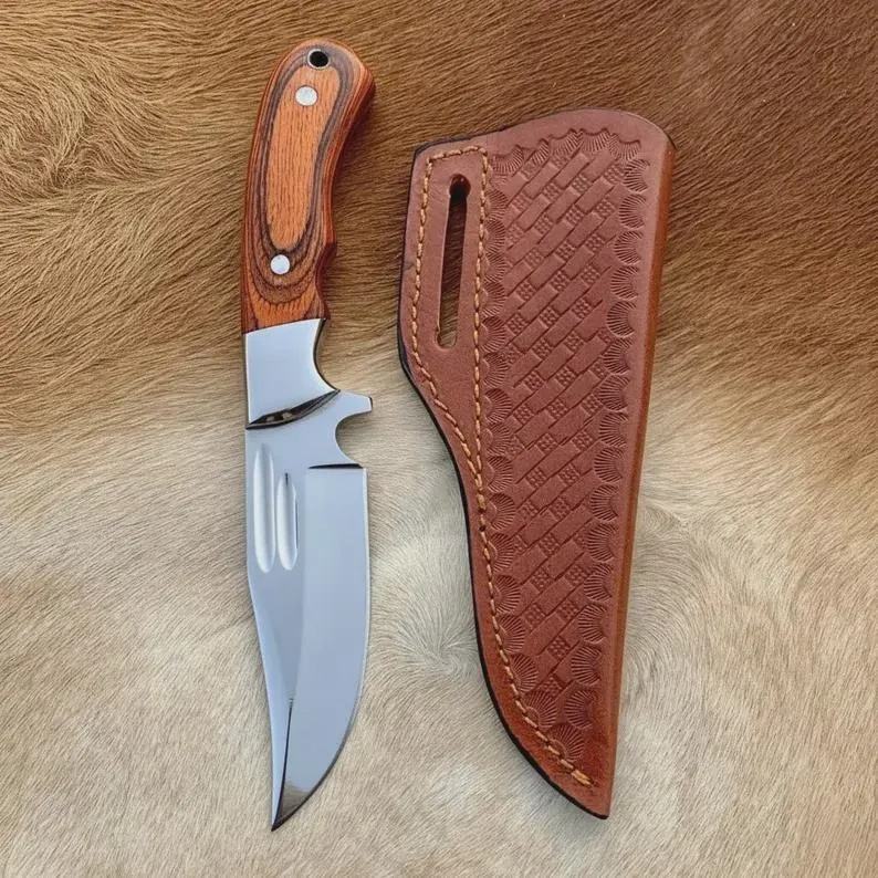 มีดใบตายเหล็กกล้าไร้สนิมเกรดอุตสาหกรรม ด้ามไม้ ปลอกหนัง สำหรับตั้งแคมป์ ล่าสัตว์ รับผลิตแบบ OEM