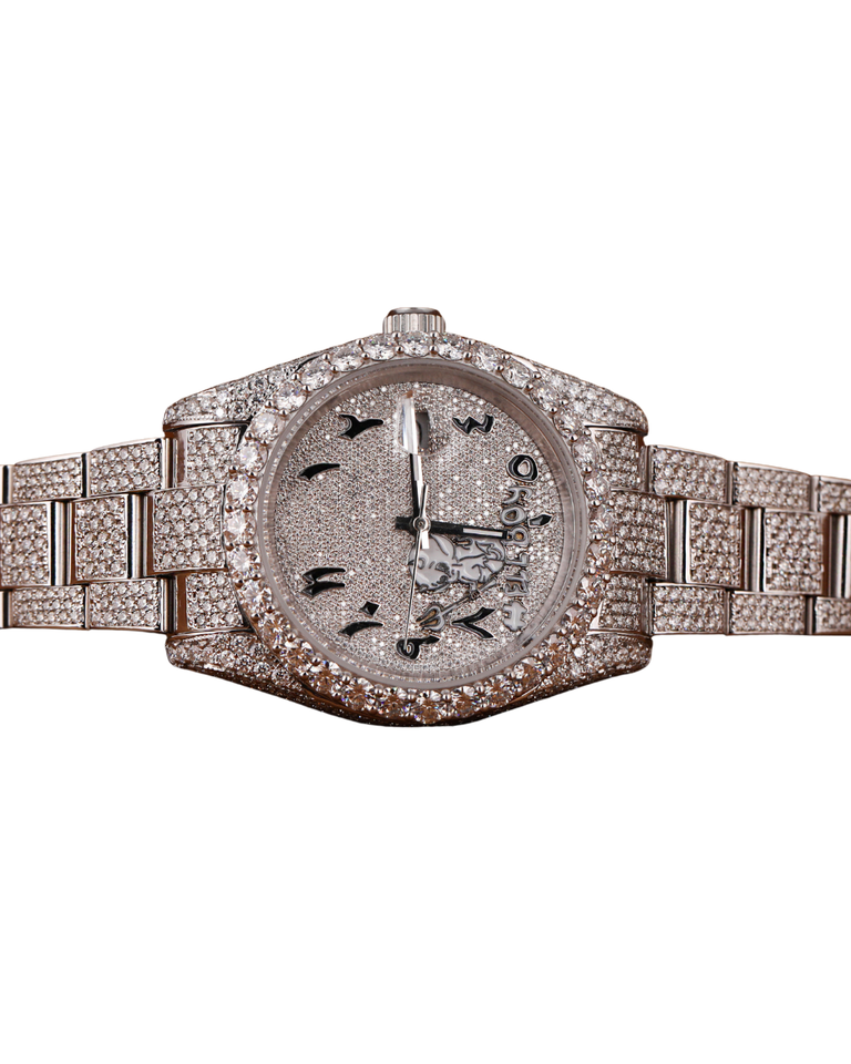 นาฬิกาข้อมือผู้ชายแบบกลไก ตัวเรือนทองคำขาวเต็มรูปแบบ ประดับเพชรโมอิสซาไนต์ VVS ทรงกลม ตัวเลขบนหน้าปัดแบบ Iced Out ปรับแต่งได้ตามต้องการ