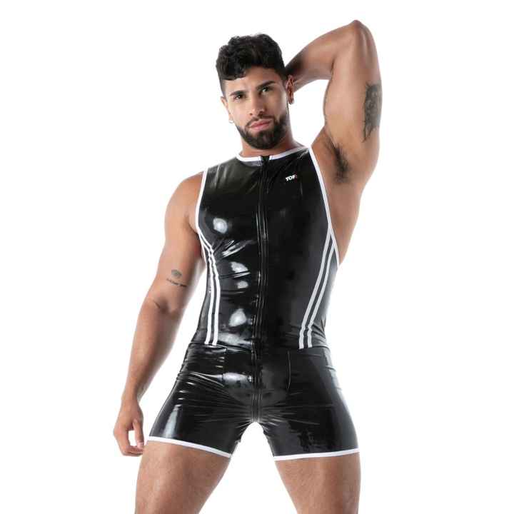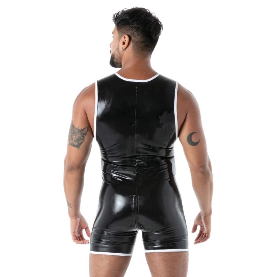 ชุดบอดี้สูทแบบเต็มตัวสีดำสำหรับผู้ชาย ทำจากลาเท็กซ์เนื้อนุ่ม ยืดหยุ่นได้ กระชับรูปร่าง เหมาะสำหรับงานปาร์ตี้และชุดคลับแวร์แนวเฟติช
