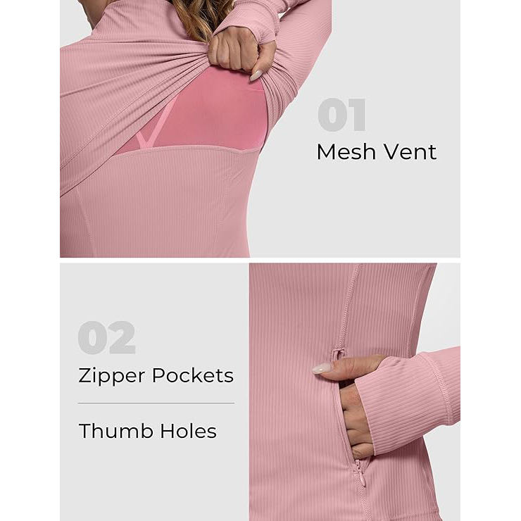 เสื้อแจ็คเก็ตโยคะแบบซิปเต็มตัวสำหรับผู้หญิง คอสูง มีรูสำหรับนิ้วโป้ง ทรงเข้ารูป ผลิตจากไนลอนผสมสแปนเด็กซ์ ยืดได้สี่ทิศทาง ระบายอากาศได้ดี แห้งเร็ว