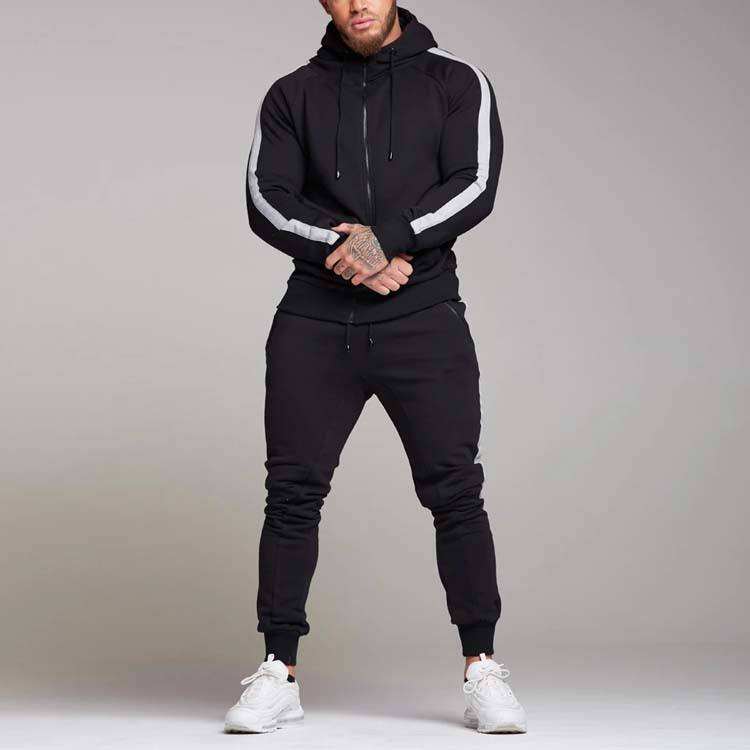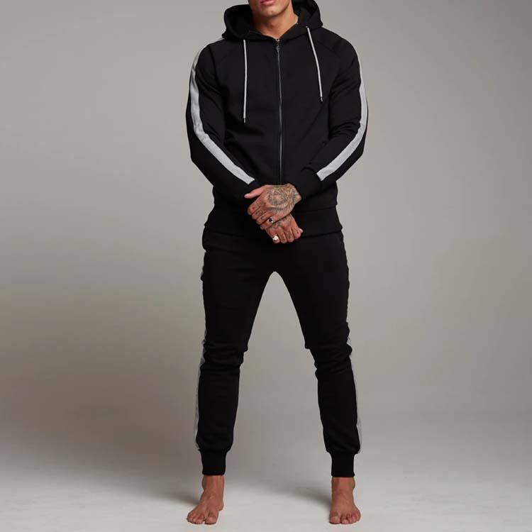 ชุดเซ็ตเสื้อแจ็คเก็ตซิปเต็มตัวและกางเกงขายาวสไตล์สตรีทแวร์สำหรับผู้ชาย ชุดวอร์มเรียบง่ายทรงเข้ารูป รับสกรีนโลโก้