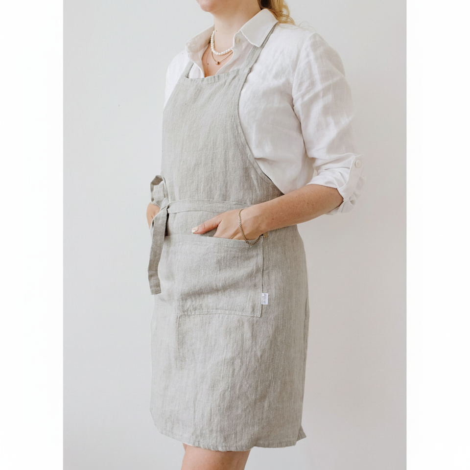 ชุดผ้ากันเปื้อนผ้าลินินมีกระเป๋าสำหรับผู้หญิงชุดทำอาหารในครัวแบบนุ่มสำหรับใช้ในเชิงพาณิชย์