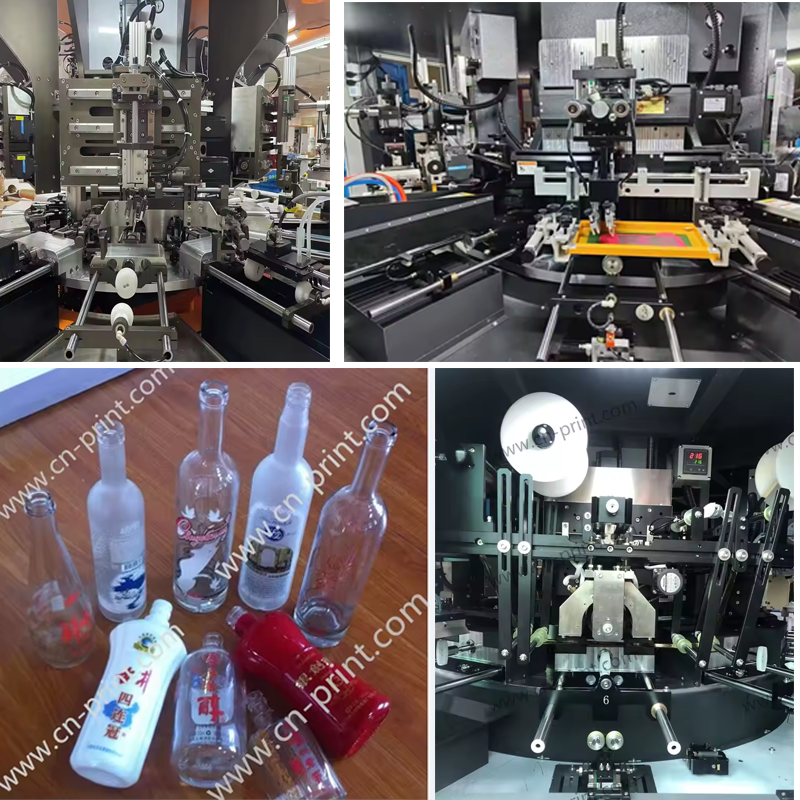 เครื่องพิมพ์สกรีนทรงกระบอกอัตโนมัติเต็มรูปแบบสำหรับขวดน้ำหอมแก้วแบบ 360 องศา ° เครื่องอบยูวีและเครื่องลงทะเบียน