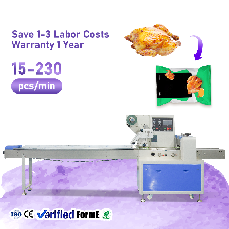 เครื่องบรรจุภัณฑ์แบบห่อแนวนอนอัตโนมัติเต็มรูปแบบ เครื่องบรรจุภัณฑ์แบบฟลอว์แพ็คสำหรับผลไม้ ผัก และไก่