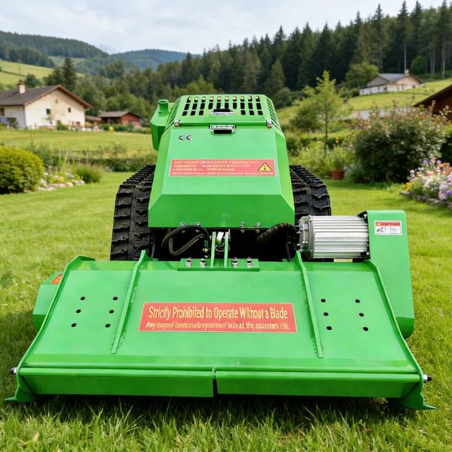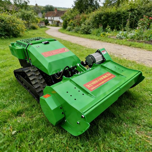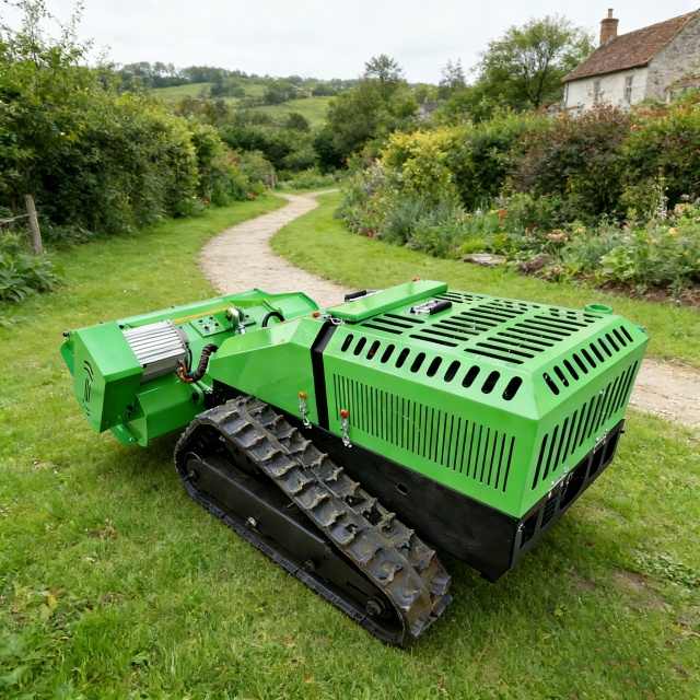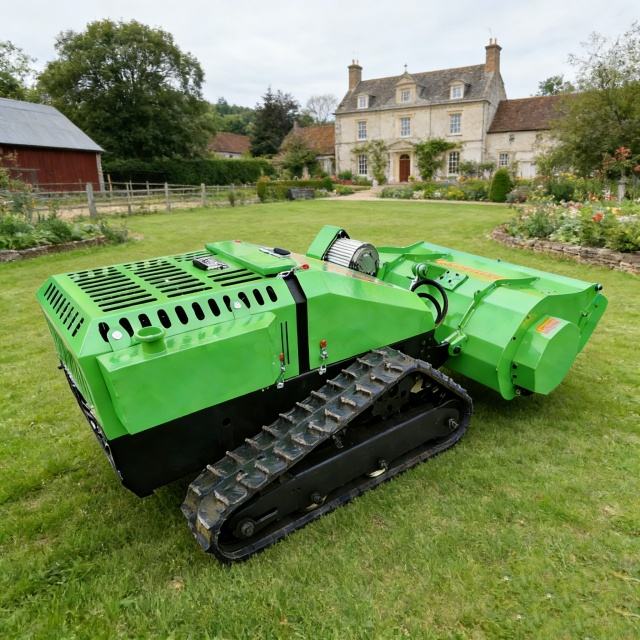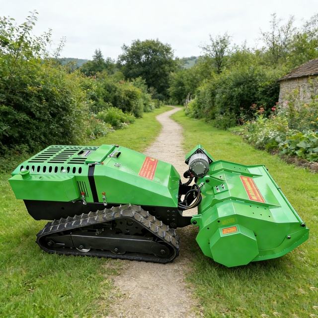 หุ่นยนต์ตัดหญ้าและกำจัดวัชพืชแบบอัตโนมัติเต็มรูปแบบ ควบคุมด้วยรีโมท ใช้สายพานตีนตะขาบ เหมาะสำหรับพื้นที่ลาดชัน สนามหญ้า และสวน