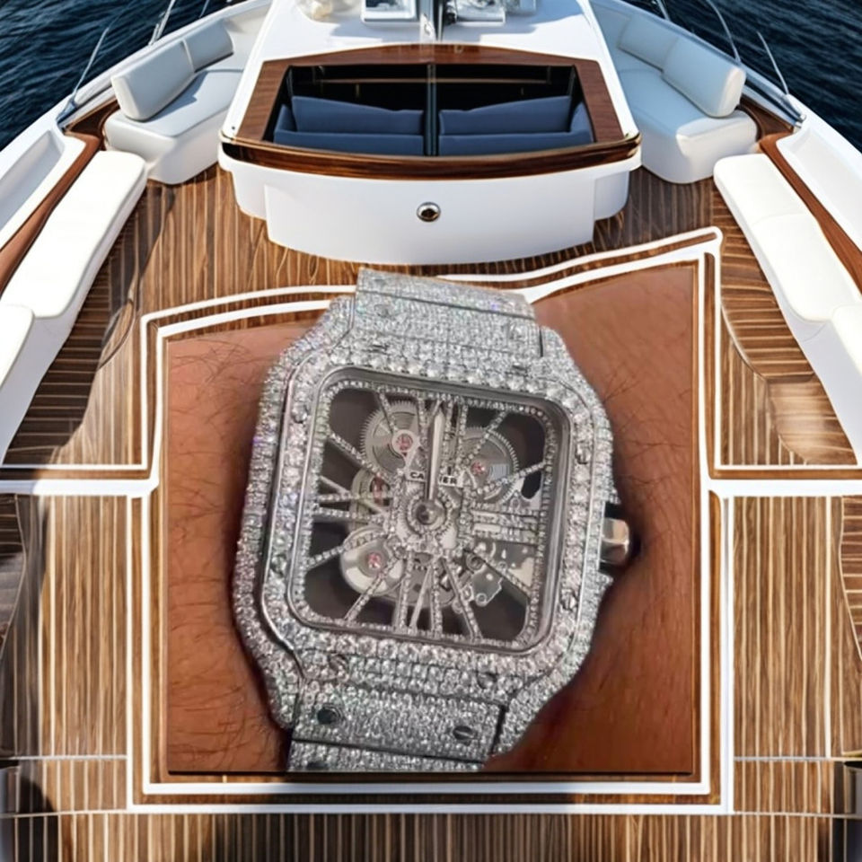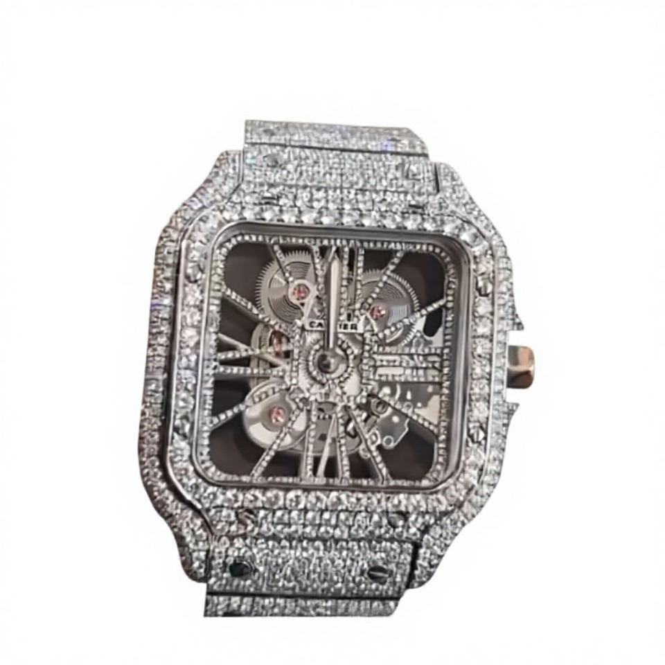 นาฬิกาเหล็กฝังเพชรโมอิสซาไนต์เต็มหน้าปัด - กลไกแบบโครงกระดูก - ผ่านการทดสอบเพชร VVS