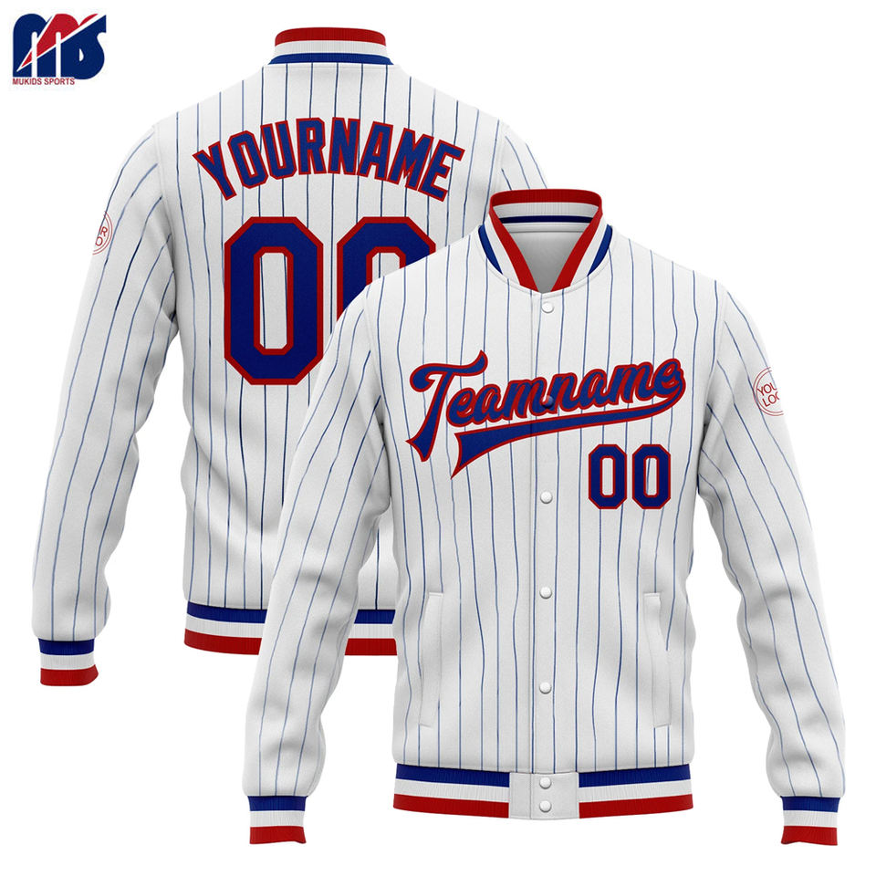 แจ็คเก็ตเบสบอลแบบมีกระดุมติด ปรับแต่งได้เต็มที่ พร้อมพิมพ์ลายแบบ Sublimation ใส่ชื่อ หมายเลข และป้ายทีมของคุณได้