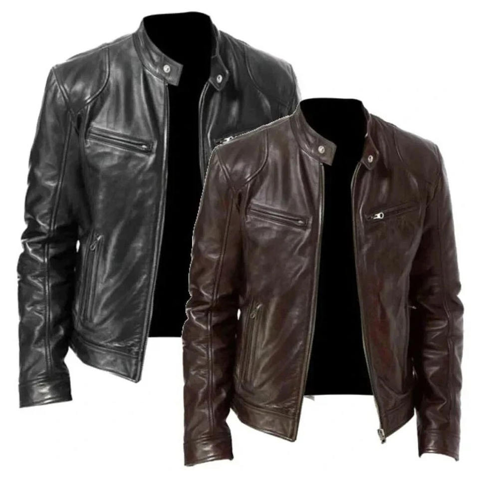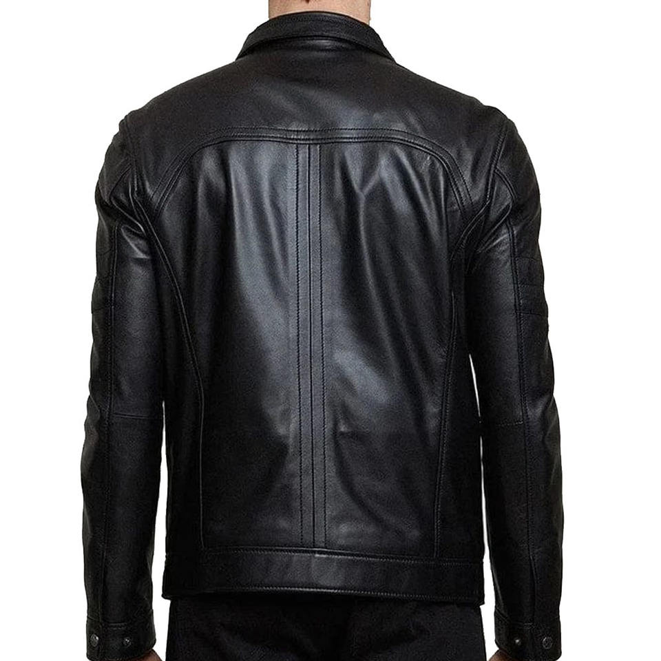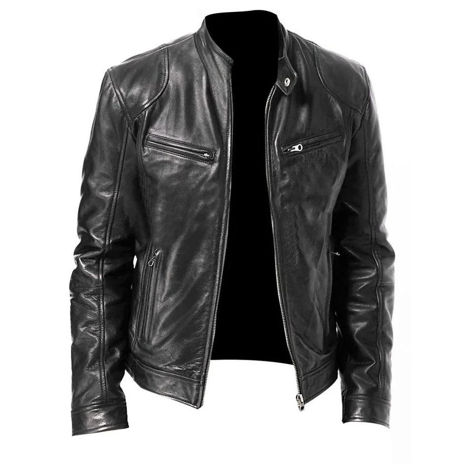 แจ็กเก็ตหนังแท้สีดำสำหรับผู้ชายทรงสลิมฟิตพร้อมคอตั้งและกระเป๋ามีซิป