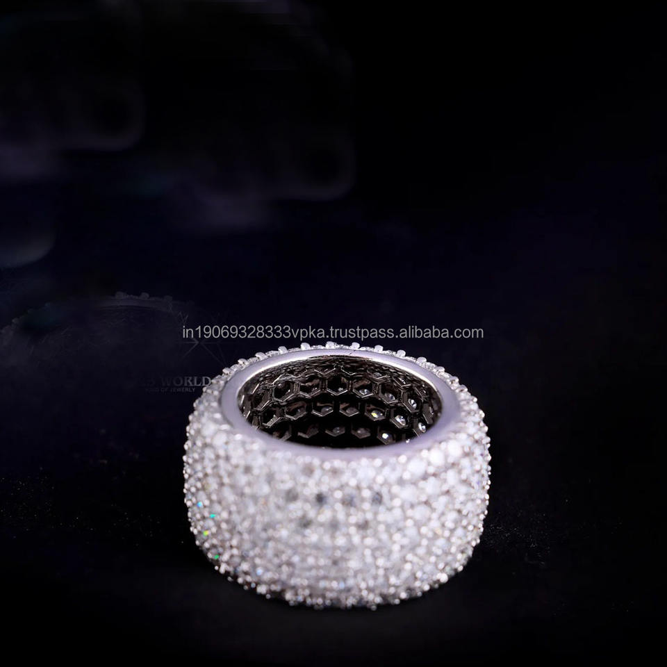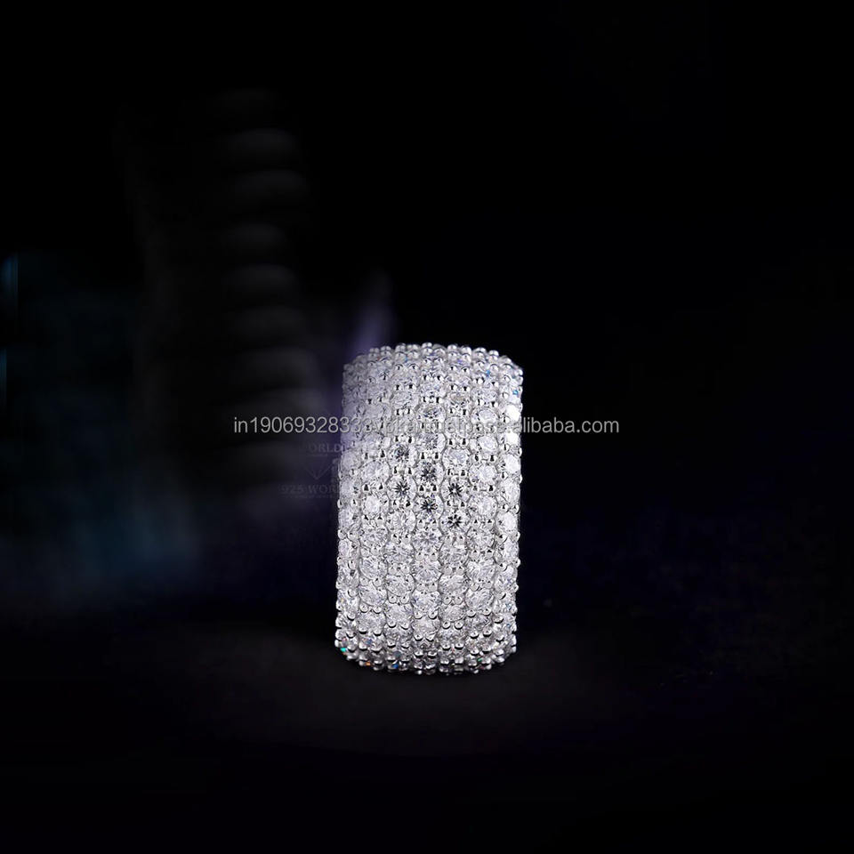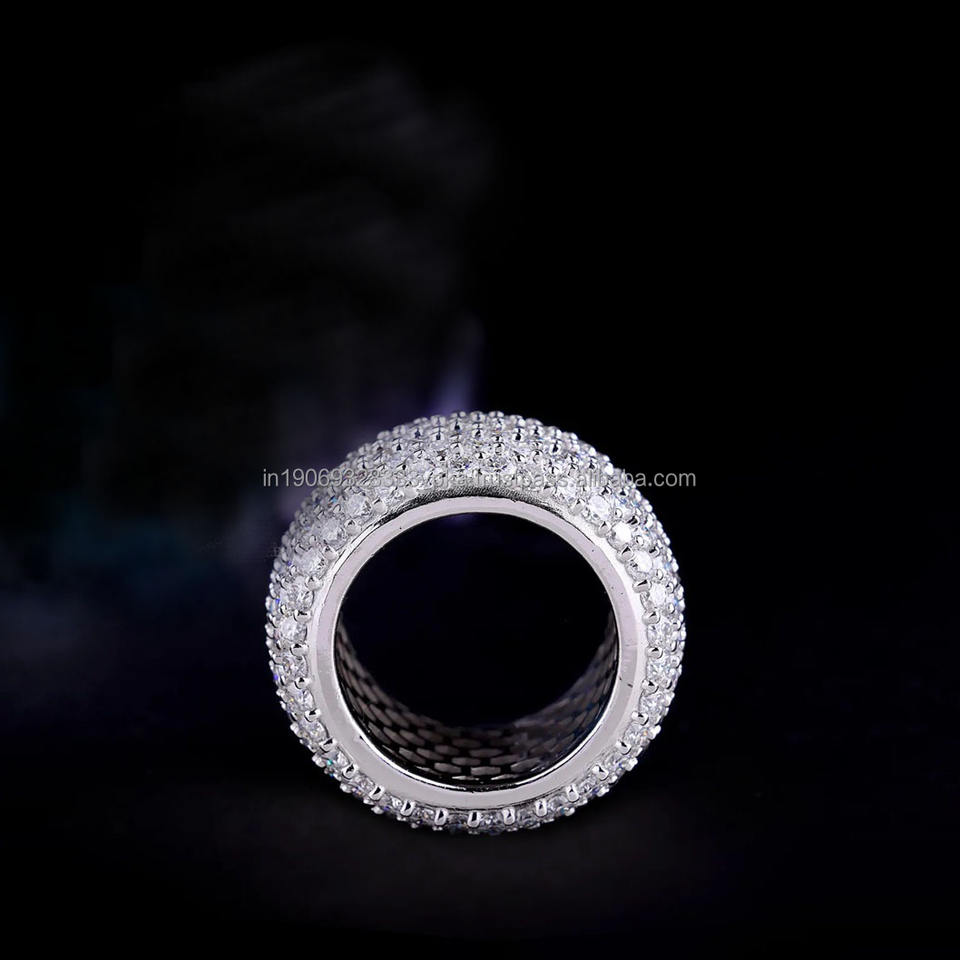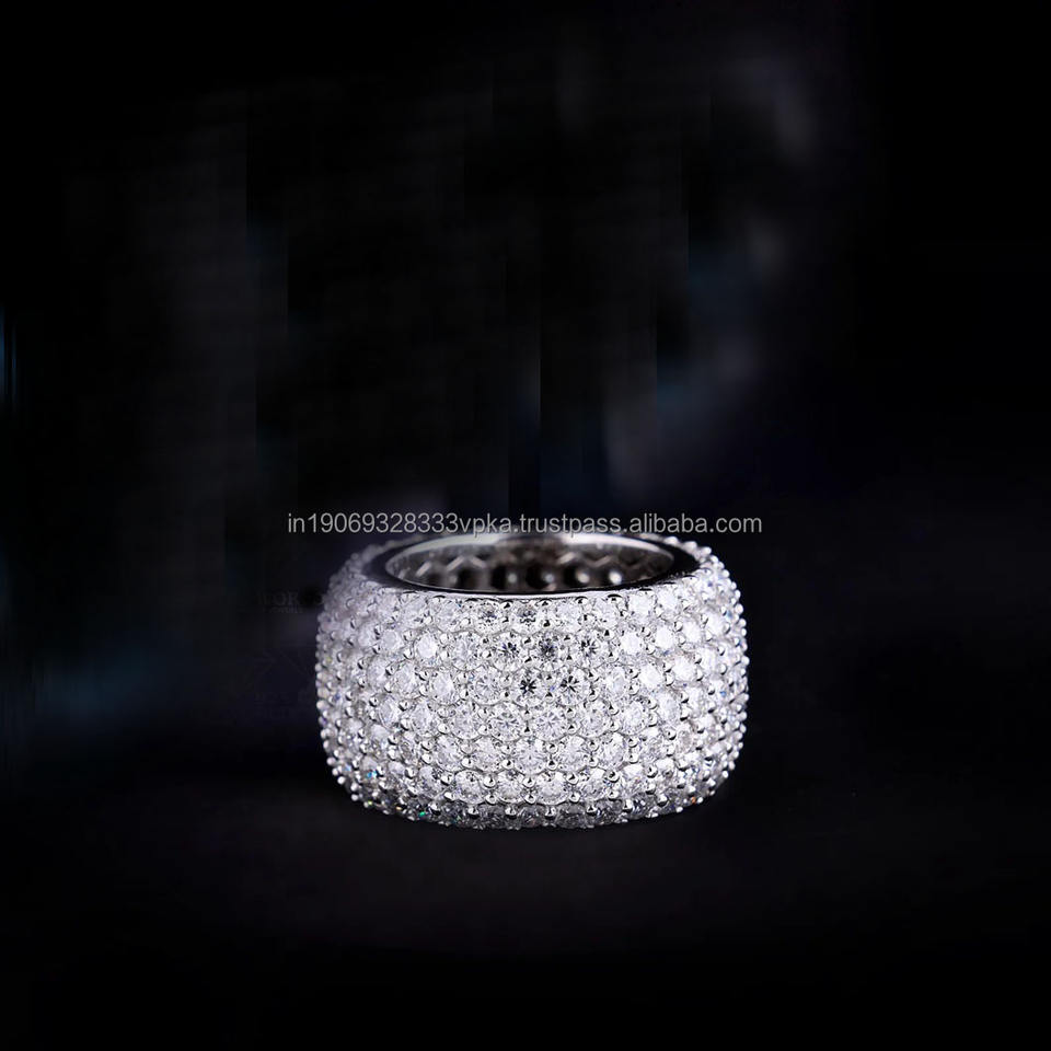 แหวนหมั้นผู้ชายประดับเพชรโมอิสซาไนต์ 7 แถวเต็มวง ดีไซน์แบบ Eternity Band ชุบทองคำขาว เงินแท้ 925 สไตล์ฮิปฮอป