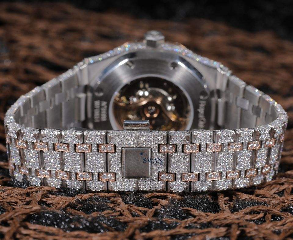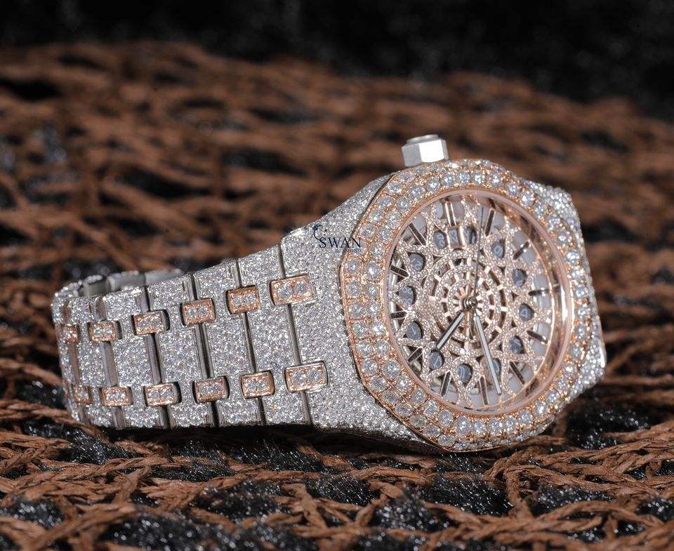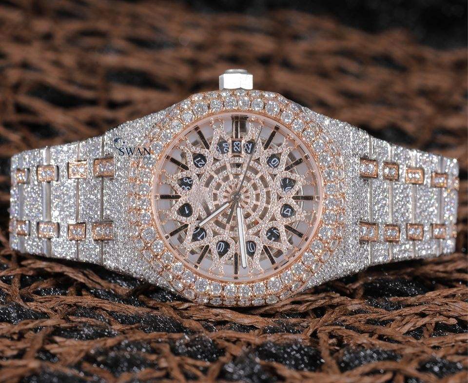 นาฬิกาข้อมือผู้ชายแบบอัตโนมัติประดับเพชรโมอิสซาไนต์เต็มหน้าปัด ระบบควอตซ์ สีเหลืองทอง หน้าปัดใหญ่ คริสตัลแซฟไฟร์ โครโนกราฟ กันน้ำ