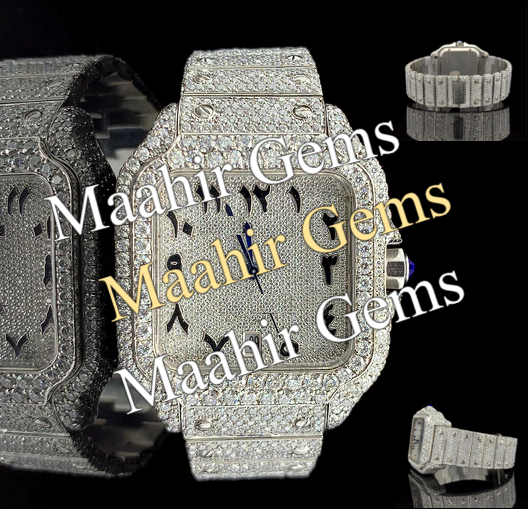 นาฬิกาหรูหราประดับเพชรโมอิสซาไนต์เต็มหน้าปัด ตัวเรือนสีเงิน สายสแตนเลสสตีลประดับเพชรโมอิสซาไนต์ กันน้ำได้ 10 บาร์ พร้อมตัวล็อคแบบหนีบ