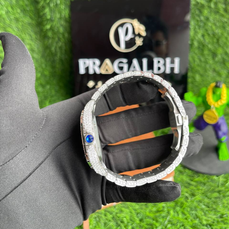 นาฬิกาหรูอัตโนมัติทรงสี่เหลี่ยม ตัวเรือนสแตนเลส กระจกแซฟไฟร์ กันน้ำ ประดับเพชร ดีไซน์โครงกระดูก ฝังเพชรโมอิสซาไนต์เต็มหน้าปัด