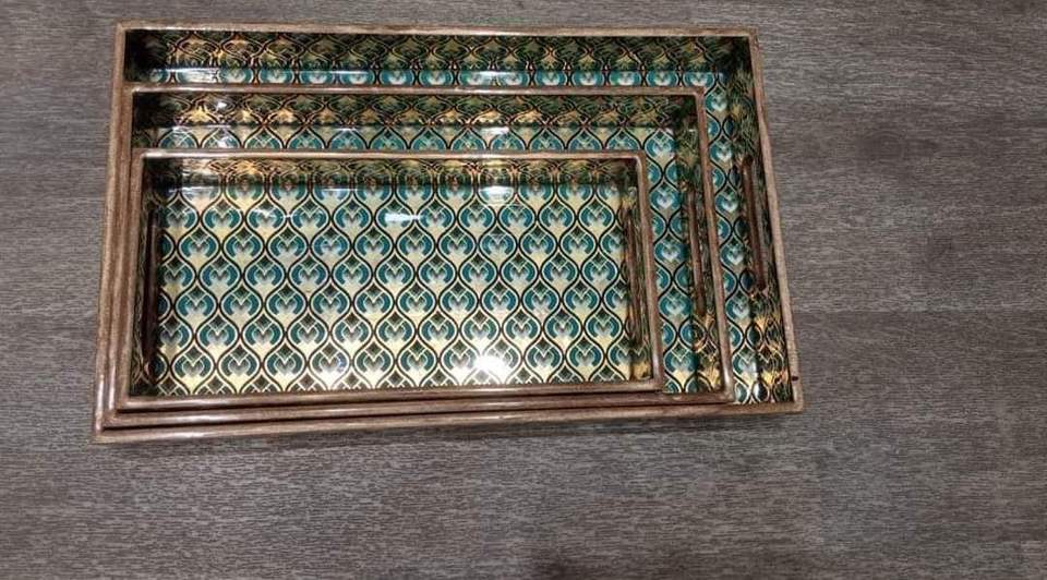 ถาดเสิร์ฟอาหารพิมพ์เคลือบสี่เหลี่ยมผืนผ้าเต็มรูปแบบพร้อมที่จับถาดอุปกรณ์โรงงานสําเร็จรูปแบบกําหนดเองสําหรับโรงแรมการออกแบบยอดนิยม