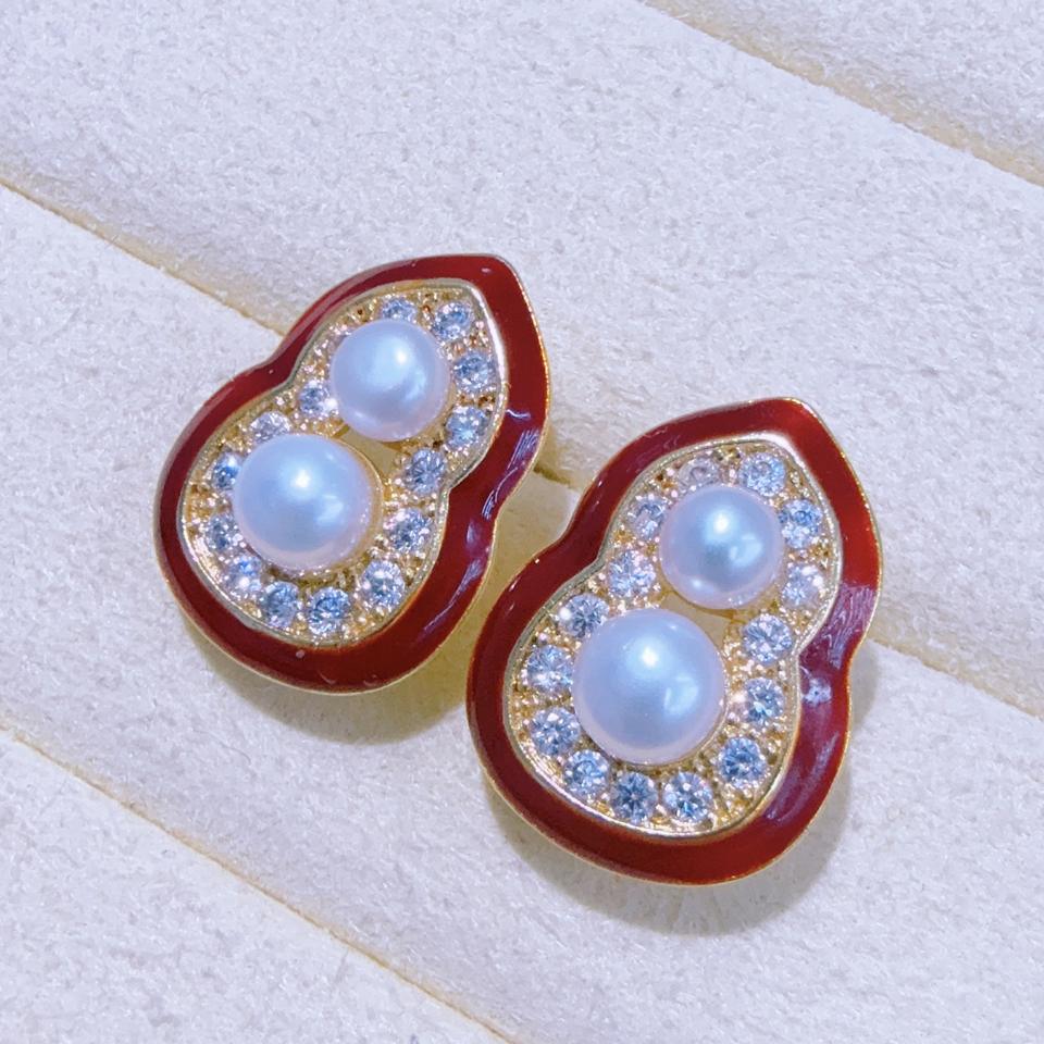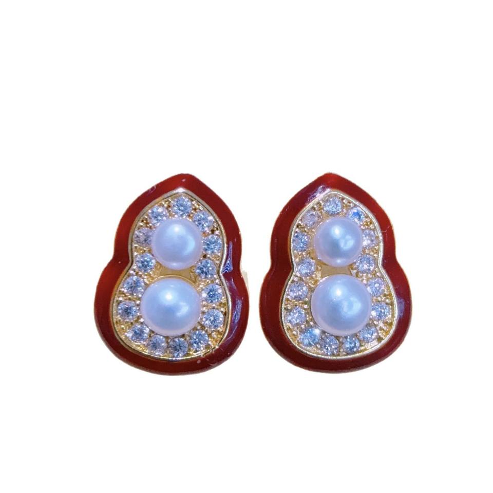 ต่างหูมุกน้ำจืดรูปน้ำเต้าเคลือบสีแดงแบบเรโทรประดับมุกเล็กๆ ดีไซน์หรูหราเบาๆ สำหรับผู้หญิง ขายส่ง