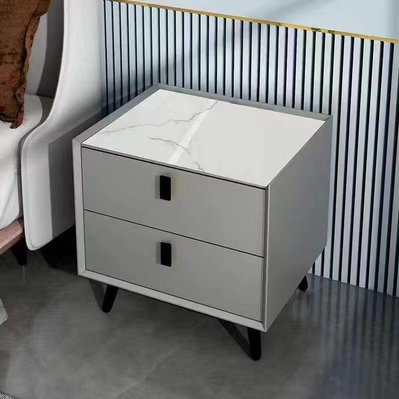 ตู้เก็บของข้างเตียงแบบลิ้นชักคู่ทันสมัยพร้อมไฟ LED หน้าท็อปโลหะ เหมาะสำหรับห้องนอนอพาร์ทเมนต์และโรงแรม