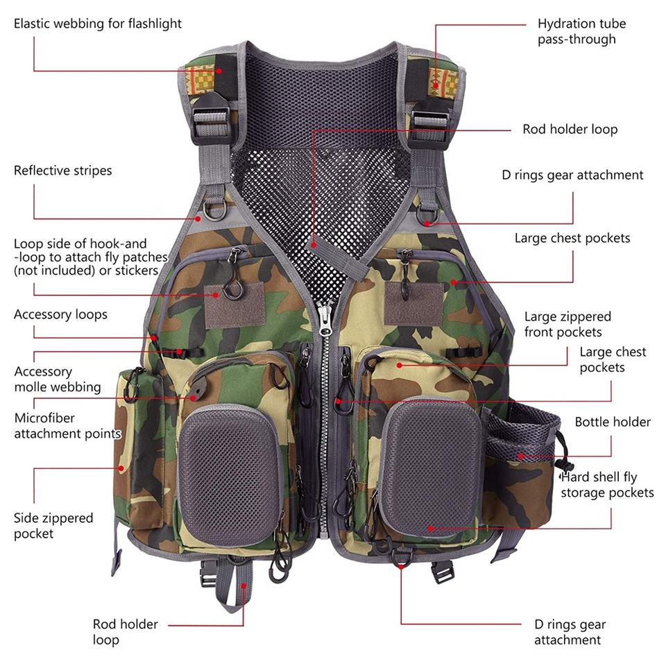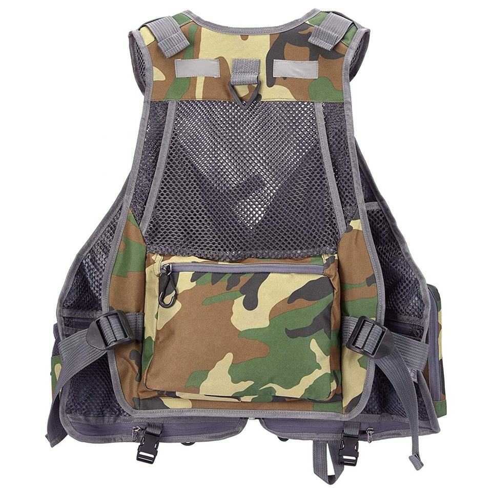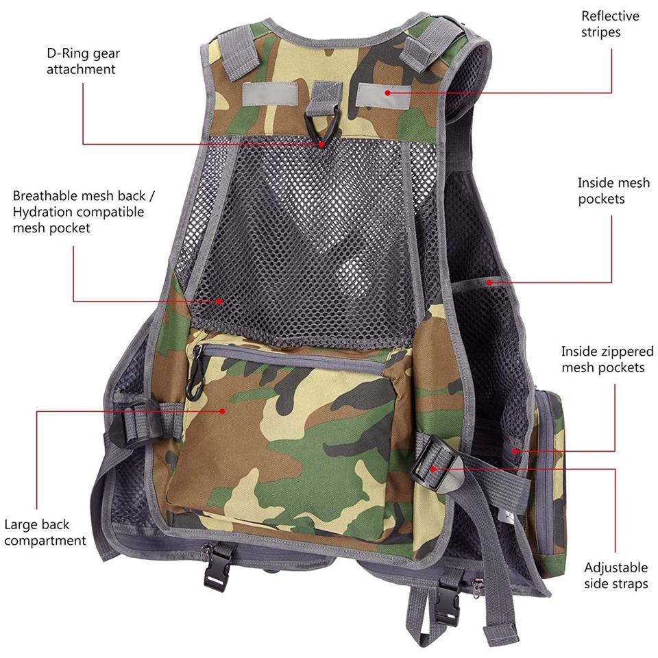 เสื้อกั๊กตกปลาระบายอากาศได้ดีมีกระเป๋าดีไซน์ลายพรางโลโก้ OEM และ ODM