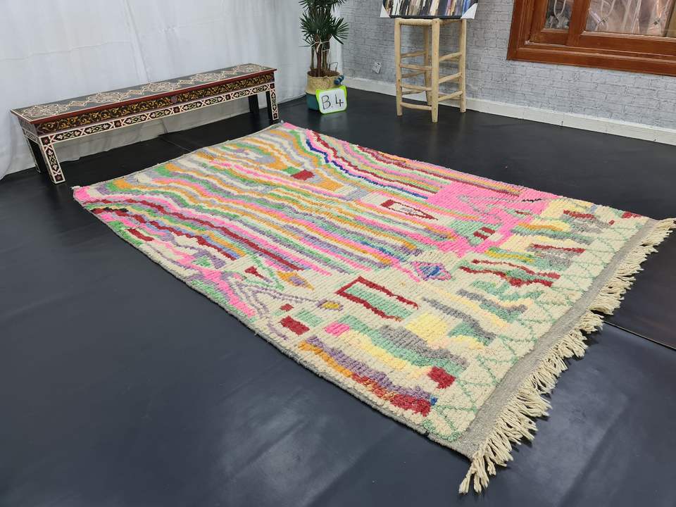 Funky พรมบูจาด5x9ลายทางแบบโมโรคพรมขนสัตว์ทำมือที่สวยงามสีชมพู & สีเขียวแสนสบายพรมโบโฮ