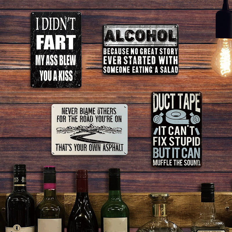 ป้ายโลหะข้อความตลกเกี่ยวกับแอลกอฮอล์ เพราะไม่มีเรื่องราวที่ดีมีต้นกำเนิดมาจากใครบางคนที่กินสลัดบาร์ ตกแต่งผนังร้านกาแฟสำหรับห้องแมนเคฟหรือโรงรถ