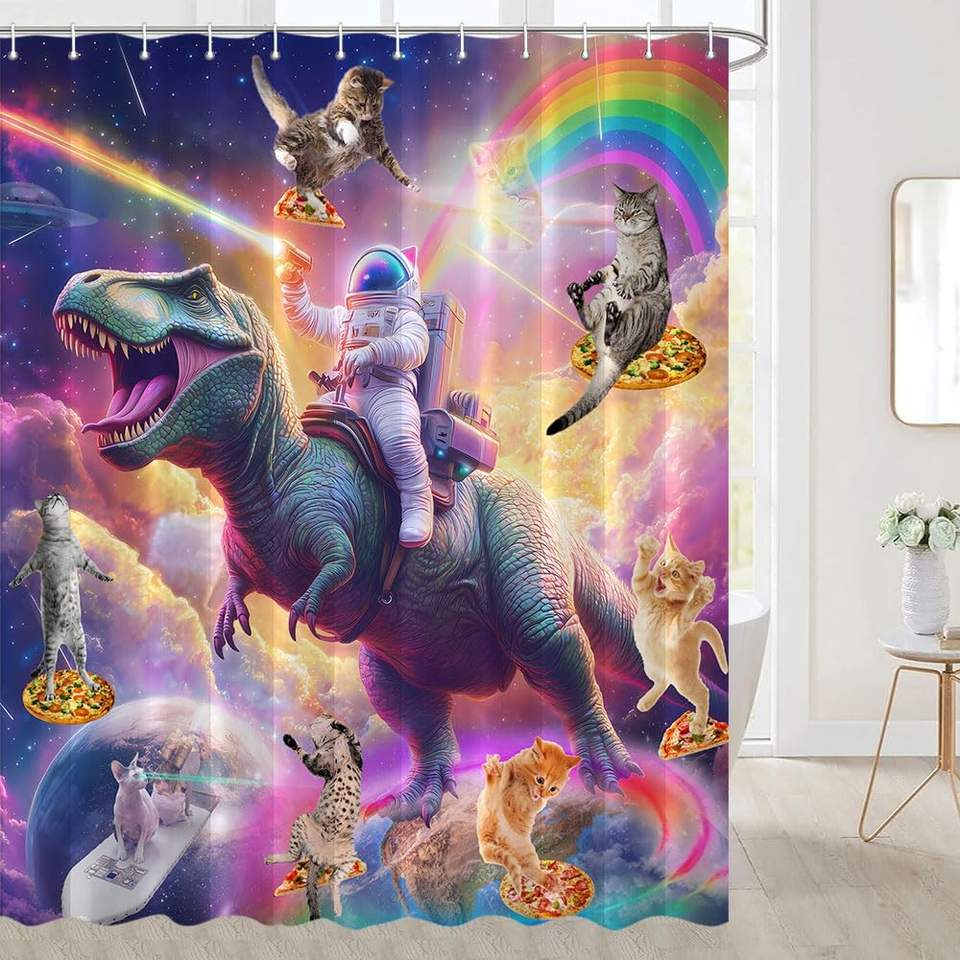 ม่านอาบน้ำรูปแมวขำขันม่านอาบน้ำลายคลื่นไดโนเสาร์มหาสมุทรความเย็นการตกแต่งบ้านสำหรับแมวการขี่ไดโนเสาร์สำหรับห้องน้ำ