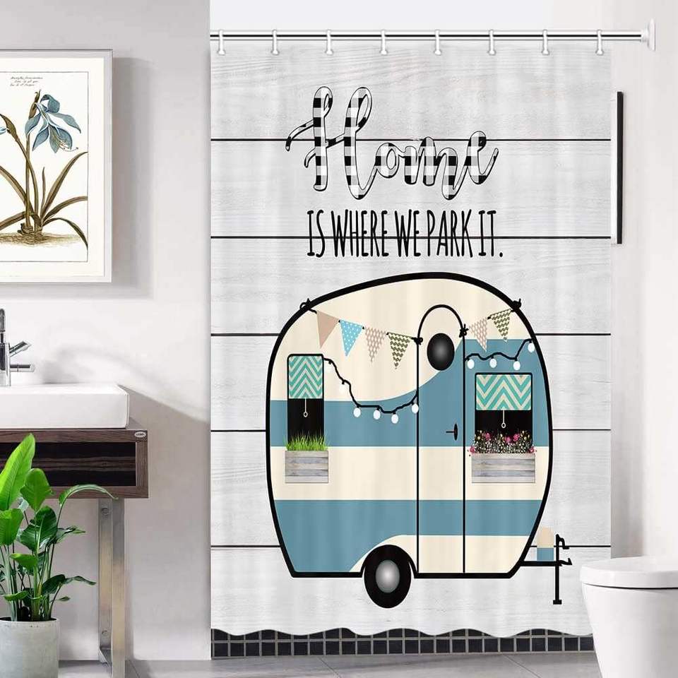 ม่านอาบน้ำลายไม้แนวชนบทตลกสีกลางของตกแต่งบ้านไร่โพลีเอสเตอร์สำหรับตั้งแคมป์บ้านค่ายขนาดเล็ก