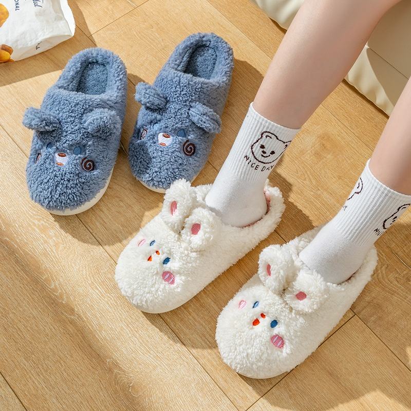 รองเท้าแตะขนสัตว์ลายกระต่าย แบดแรบบิท รองเท้าแตะผ้าฝ้าย สไตล์น่ารักใหม่ สำหรับฤดูใบไม้ร่วงและฤดูหนาว รองเท้าคู่รักใส่ในบ้าน พื้นหนา ลายการ์ตูน กันลื่น