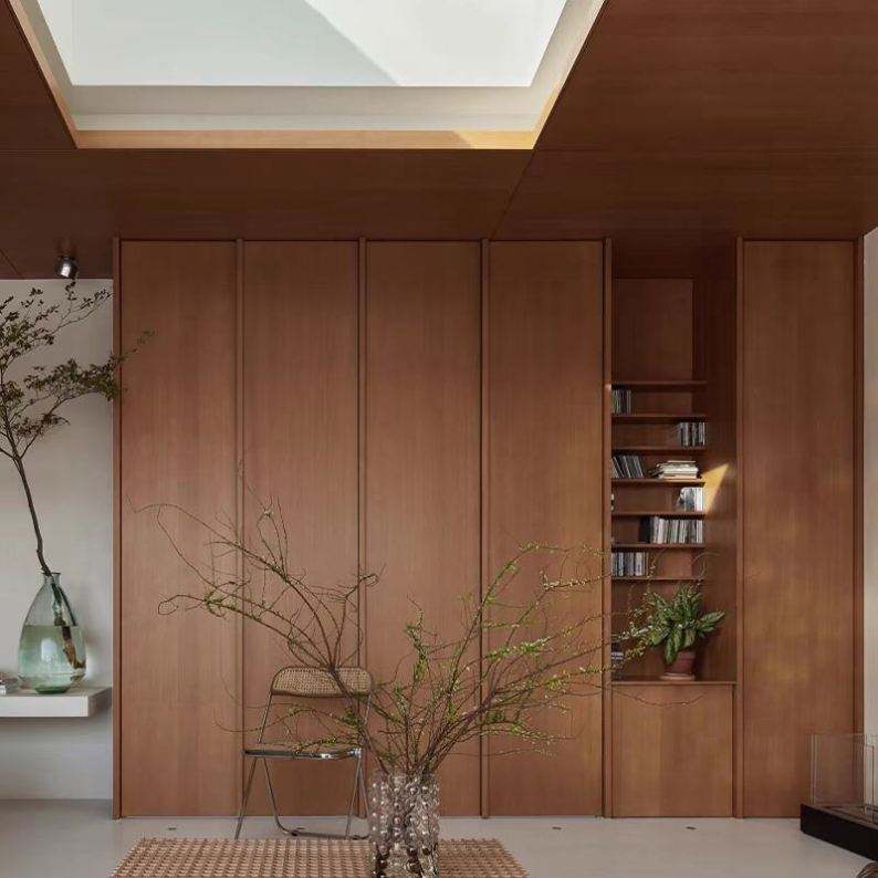 ตู้เสื้อผ้าแบบเปิดทำจากไม้ธรรมชาติพร้อมชั้นวางเสื้อผ้าเฟอร์นิเจอร์ที่ใช้งานได้และมีสไตล์
