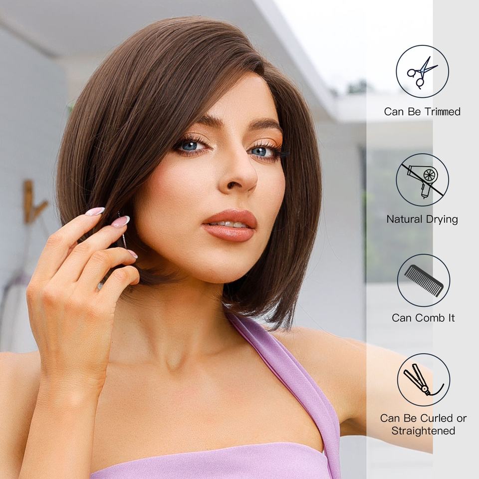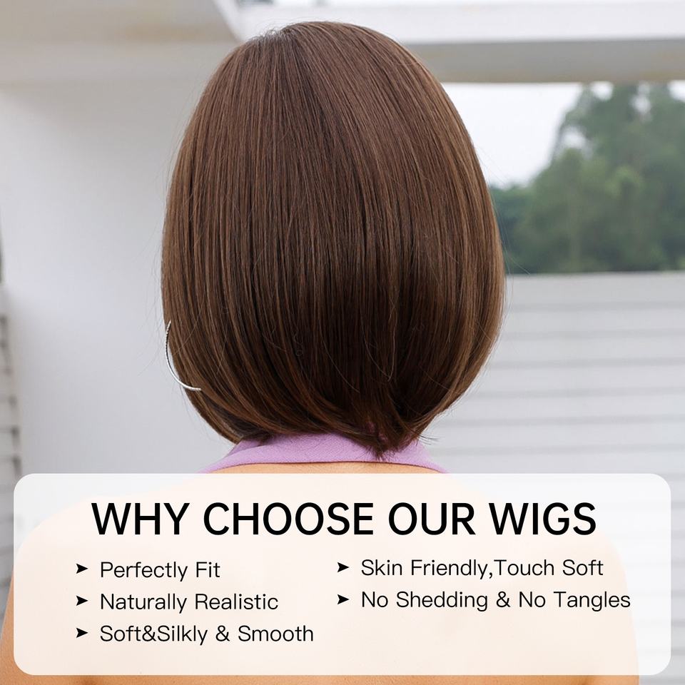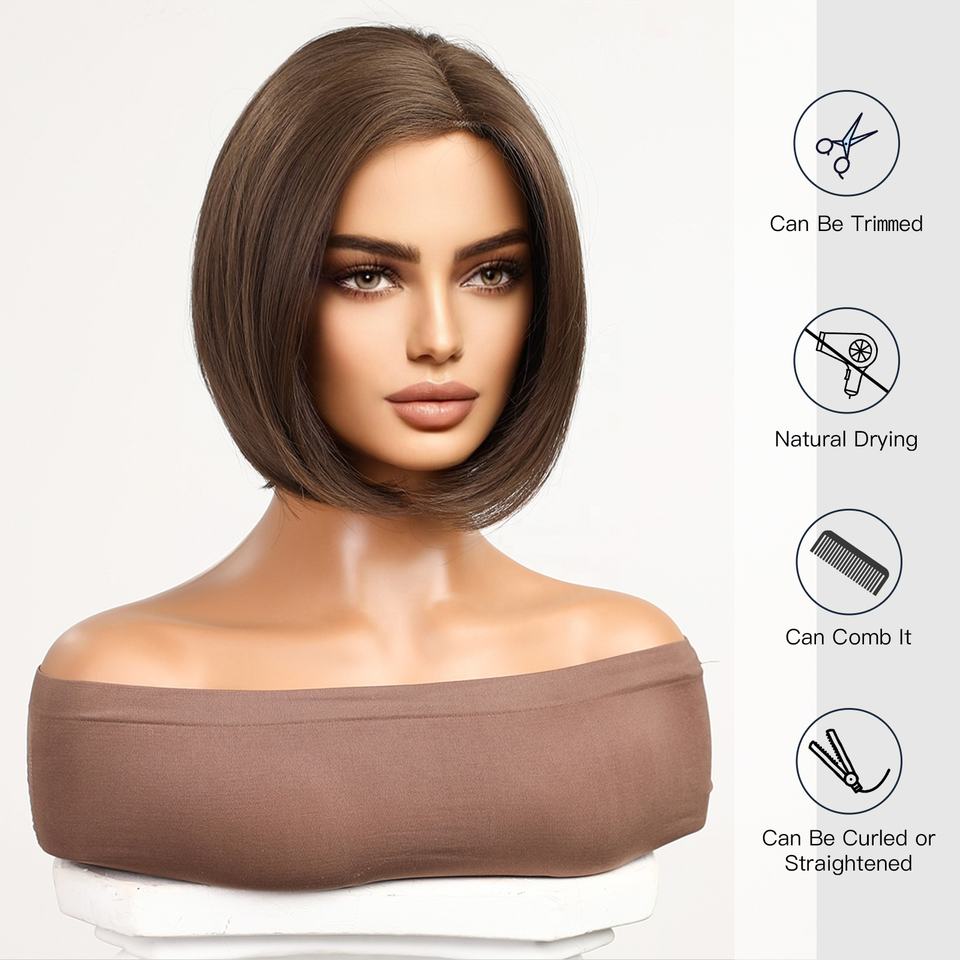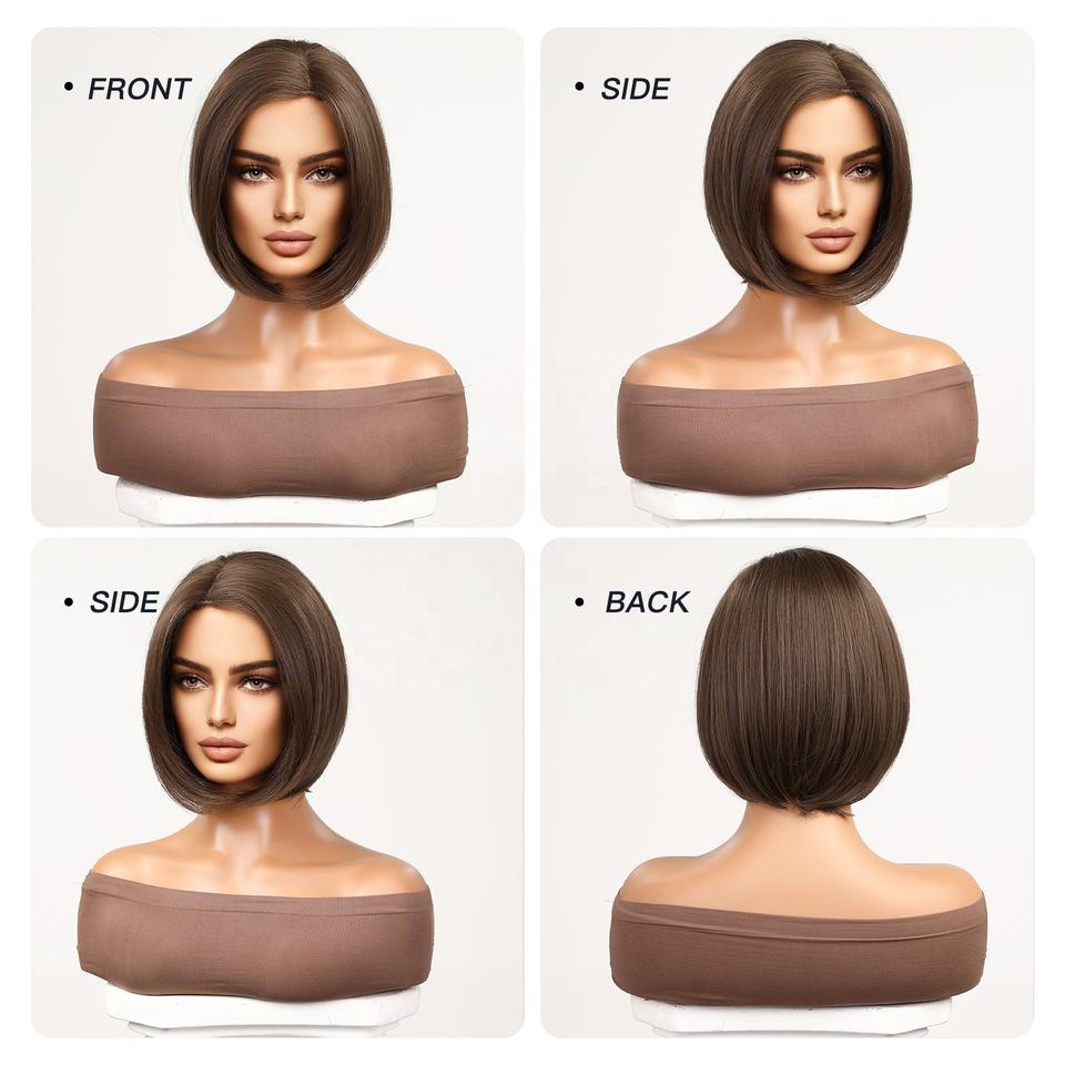 วิกผมบ๊อบตรงสีน้ำตาลเข้มมีรากผมสีน้ำตาลเข้มวิก13X1X5สังเคราะห์ผมปลอมแบบมีลูกไม้รูปตัวทีสะพายไหล่