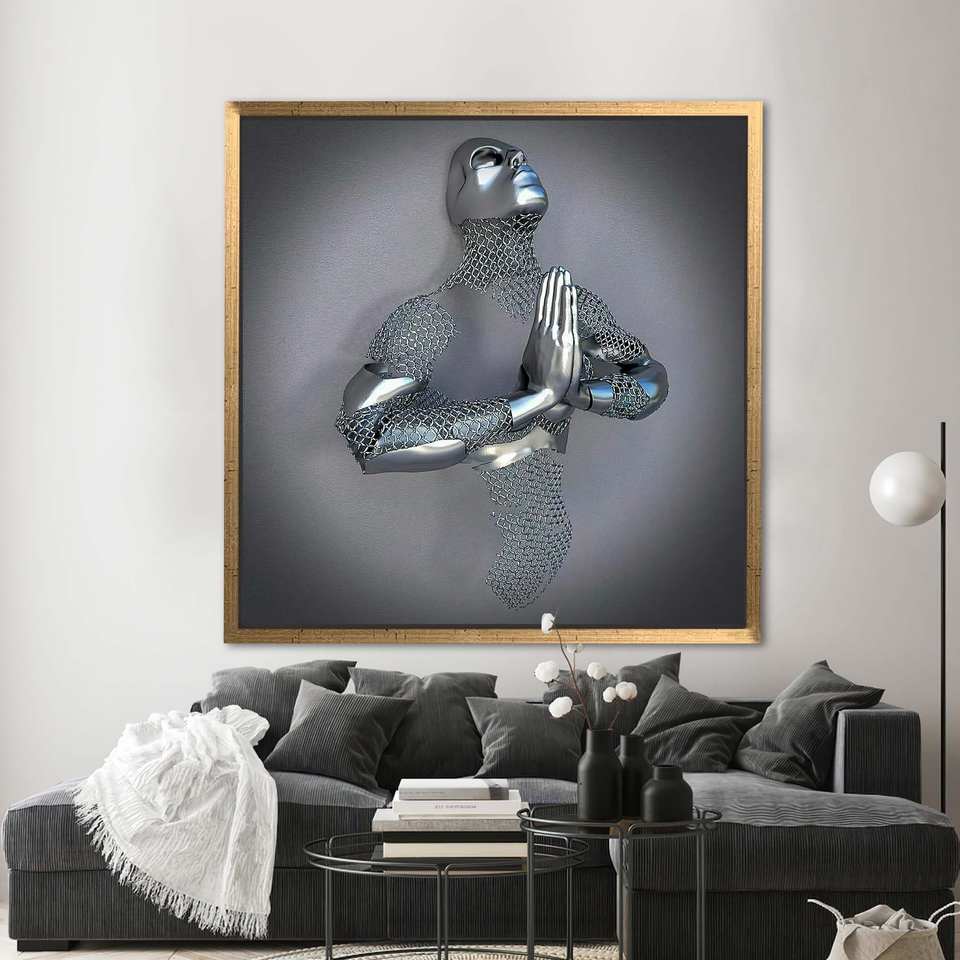 ภาพศิลปะติดผนังรูปคนกำลังสวดมนต์สไตล์ล้ำยุค - ผ้าใบพิมพ์ลายโลหะทันสมัย กรอบสีทอง