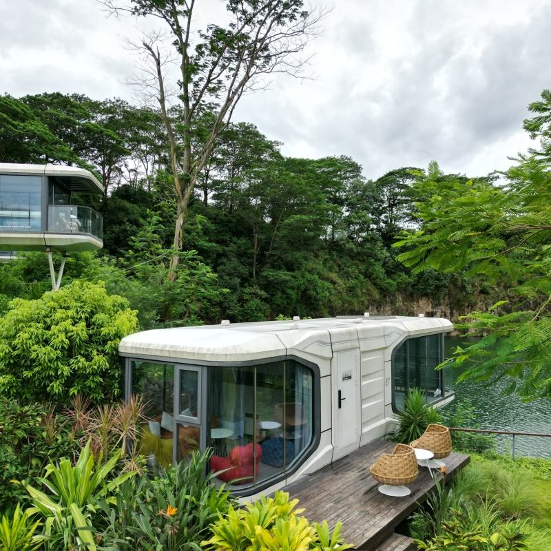 แคปซูลแคปซูลสำเร็จรูปพร้อมพื้นที่ระเบียงบ้านสำเร็จรูปพร้อมระบบอัจฉริยะสำหรับห้องนอนโรงแรม