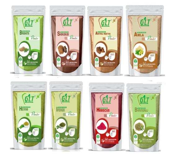 จี.แอล.ที. ผงอัมลา รีธา ชิกาไค ผงฮิบิสคัส บริงราจ บราห์มี ผงอินดิโก้ เฮนน่า สำหรับผลิตภัณฑ์ดูแลเส้นผม - ชุดคอมโบ
