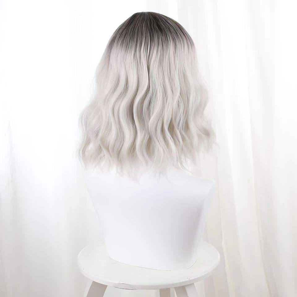 G & T วิกผมหยิกหยักศกทรงบ๊อบสั้น14นิ้วสีเทาเงินทนความร้อนมีลูกไม้สังเคราะห์ผมลอนสไตล์ลอนสีน้ำตาลเข้ม