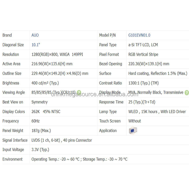G101EVN01.0 AUO LCD หน้าจอผลึกเหลวขนาด10.1นิ้ว1280*800 LVDS TFT