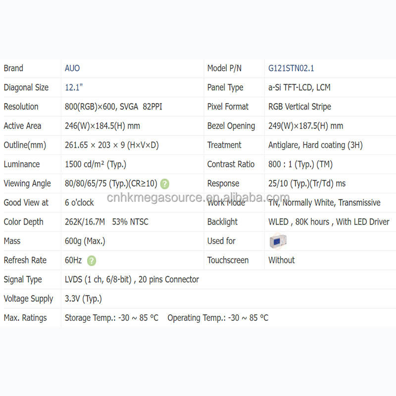 G121STN02.1 AUO แผงหน้าจอ LCD ขนาด12.1นิ้ว800*600 LVDS