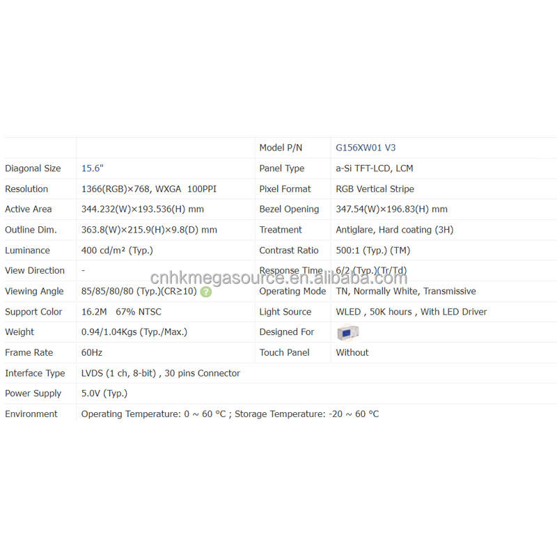 Model:G156XW01 V3