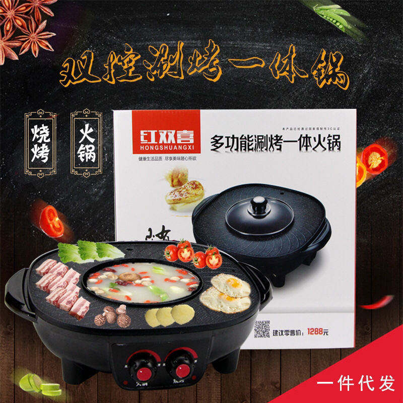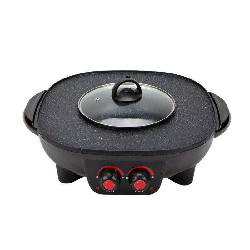 หม้อไฟฟ้าอเนกประสงค์ G808 พร้อมเตาปิ้งย่าง ควบคุมอุณหภูมิได้สองระดับ เคลือบสารกันติด PTFE ฝาแก้ว