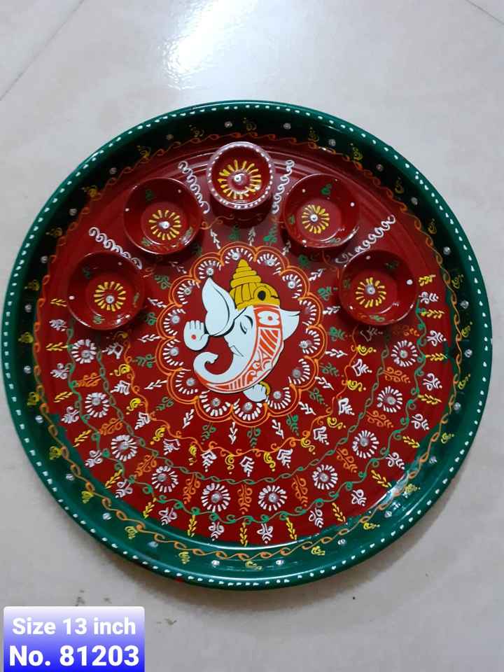 จานตกแต่งสแตนเลสลายมีนาการี ดีไซน์พระพิฆเนศ/ถาดบูชา-สีเงินมีนา พร้อมแก้วน้ำ 7 ใบ