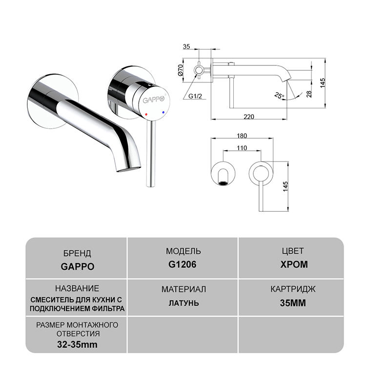 Gappo ก๊อกน้ำอ่างล้างหน้าเดี่ยวติดผนังทองเหลืองแกนวาล์วเซรามิกทำจากทองเหลือง