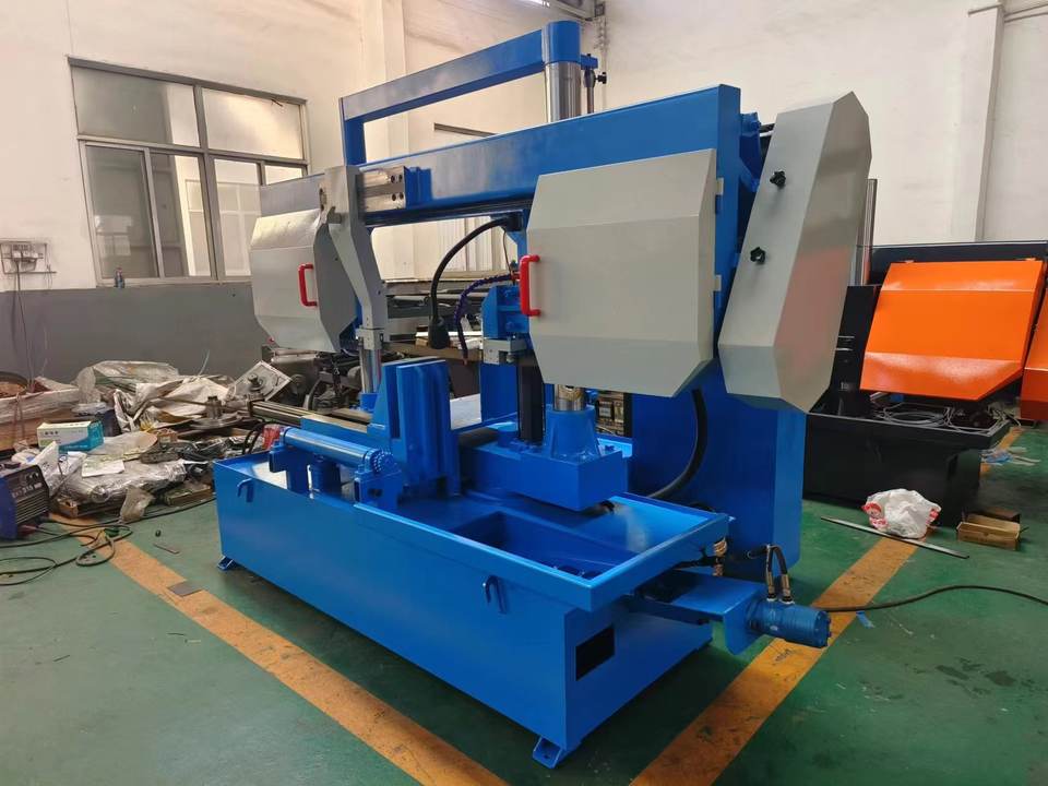 เครื่องเลื่อยสายพานคู่กึ่งอัตโนมัติเครื่องตัดโลหะแนวนอนพร้อมแรงตึงด้วยตัวเอง GB4250ใบเลื่อยส่วนประกอบหลักของมอเตอร์