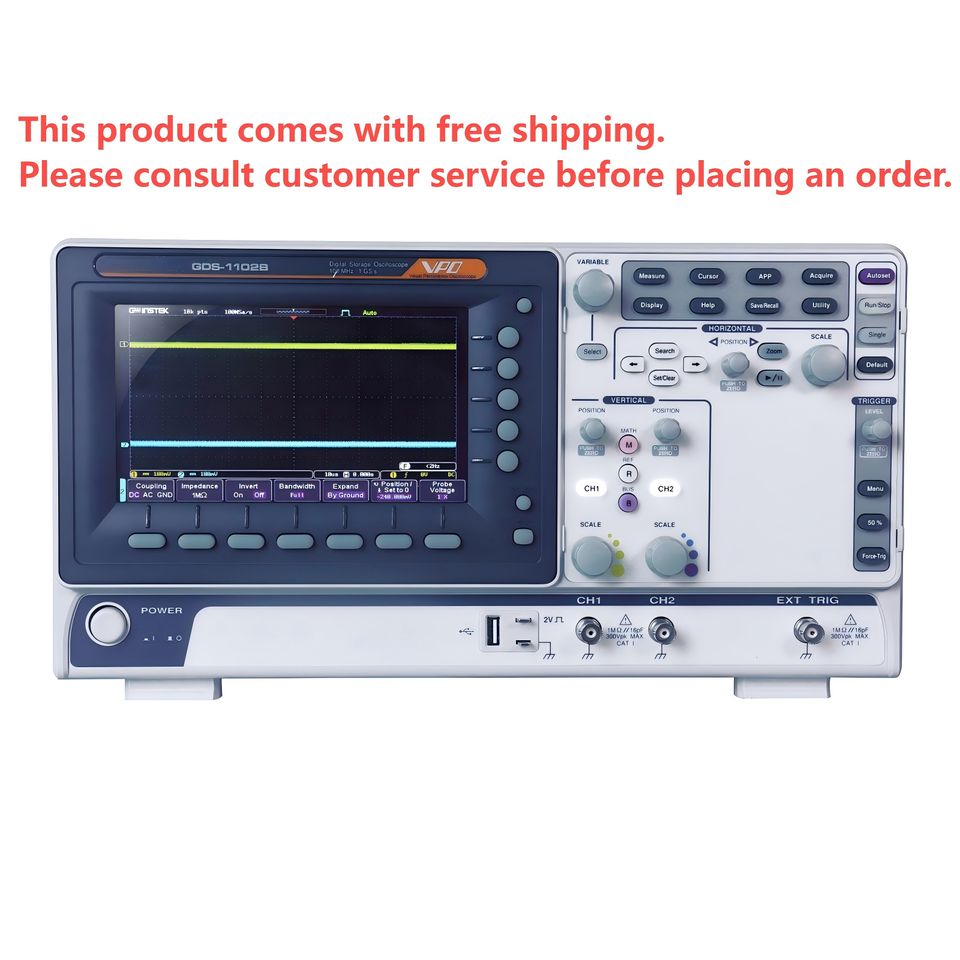 ออสซิลโลสโคปแบบดิจิตอล GDS1102B ความถี่ 100MHz แบบสองช่องสัญญาณ พร้อมหน้าจอ WXGA ขนาด 7 นิ้ว อัตราการสุ่มตัวอย่าง 1 GSa/s ความละเอียด 8 บิต