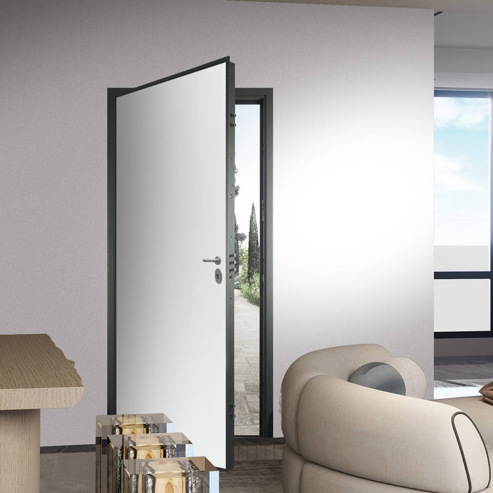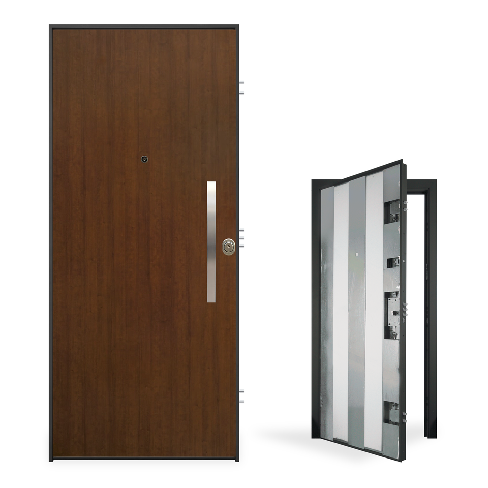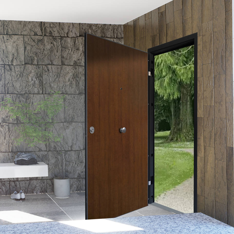 ผี: ประตูนิรภัยป้องกันการโจรกรรมหุ้มเกราะพร้อมบานพับที่ซ่อนอยู่และแผงด้านนอกวอลนัทเมลามีน