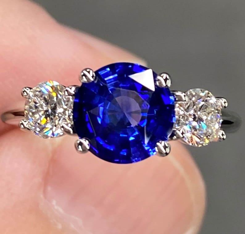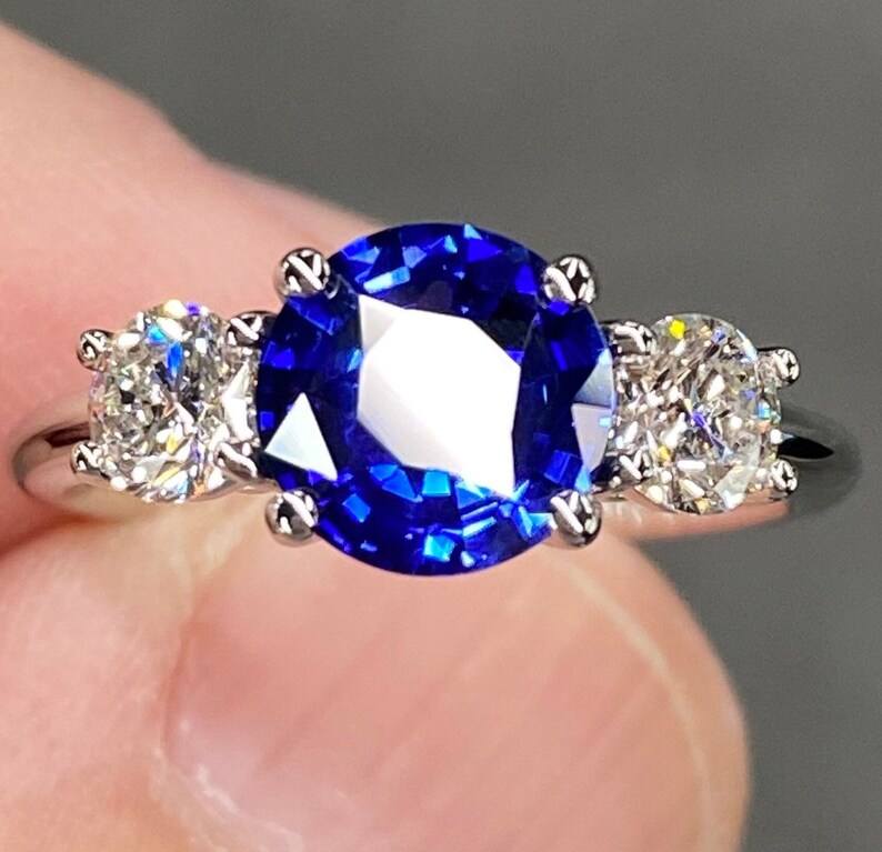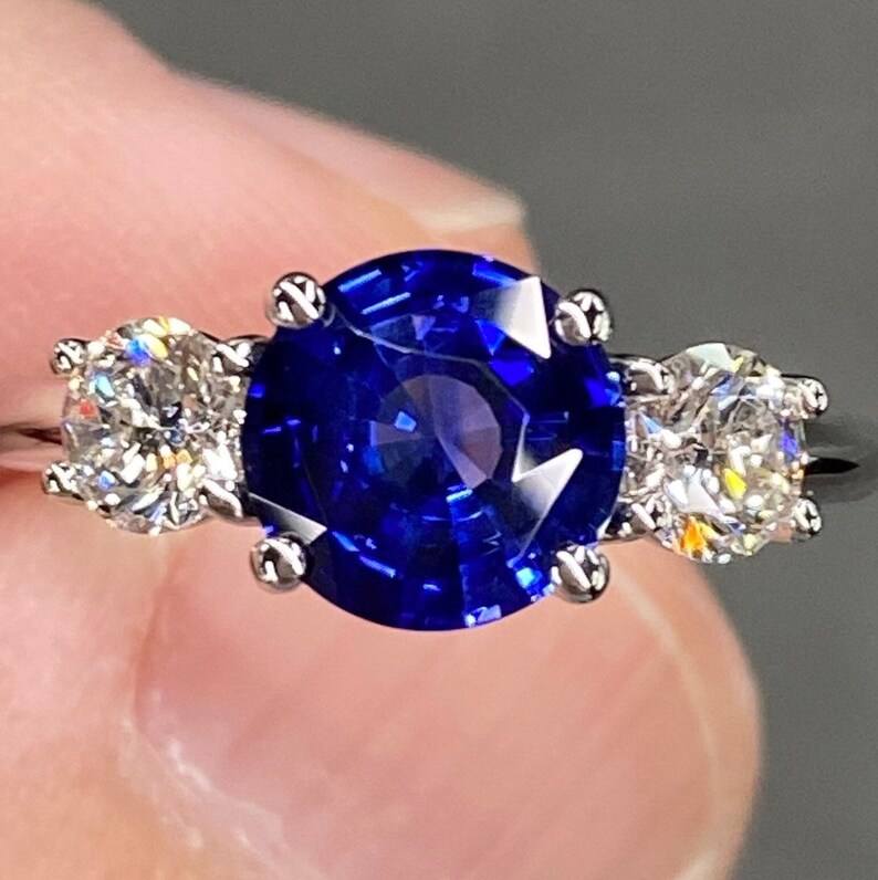 แหวนไพลินซีลอนสีน้ำเงินรอยัล GIA ระดับ E VVS เงินแท้ 925 ทรงกลม ประดับพลอยธรรมชาติสามเม็ด สำหรับงานหมั้น