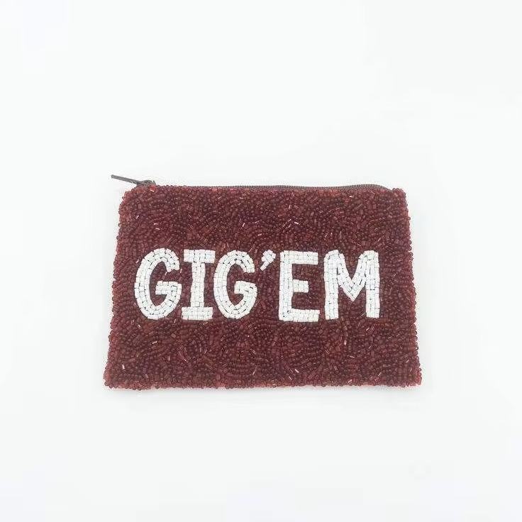 กระเป๋าใส่เหรียญ GIG EM ทำมือ ประดับลูกปัด ผ้าฝ้าย สไตล์สปอร์ต กระเป๋าใบเล็กเก๋ไก๋ ใส่เหรียญ บัตร ของใช้จำเป็น สีสันสดใส