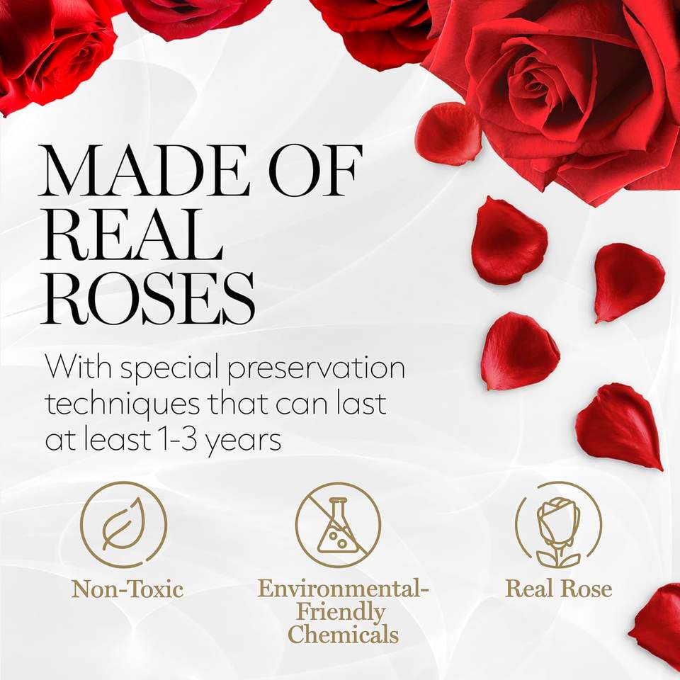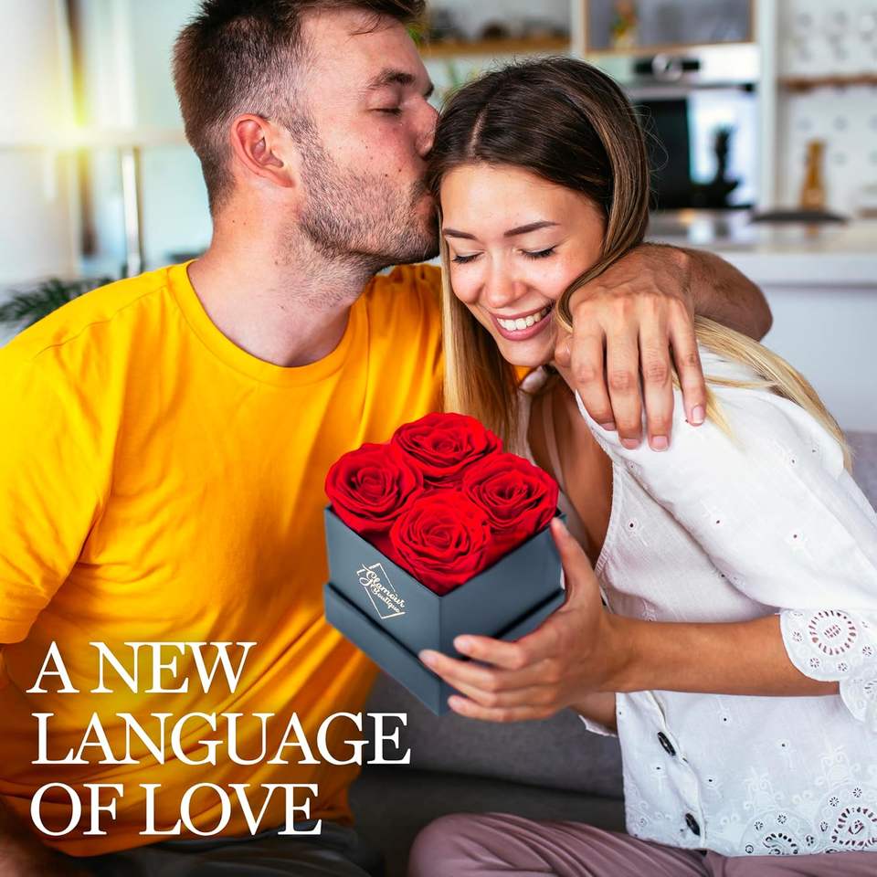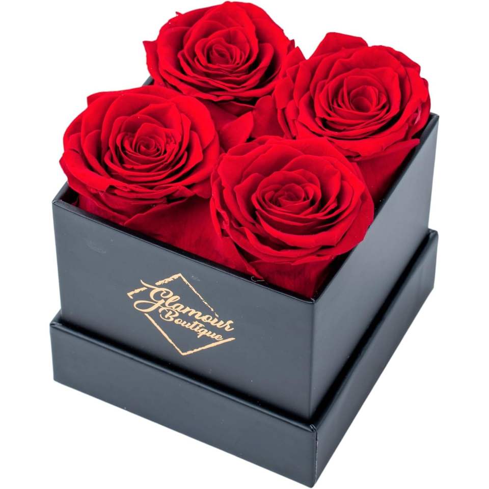 กล่องดอกกุหลาบอมตะทรงสี่เหลี่ยม 4 ดอกสีแดง ของขวัญวันเกิด ตกแต่งโต๊ะสวยหรู เป็นมิตรต่อสิ่งแวดล้อม