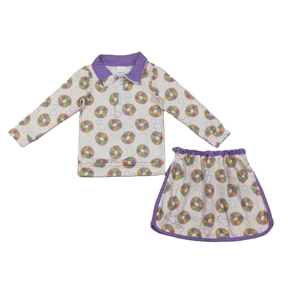 GLD1332 RTS ชุดเด็กผู้หญิงโยคะสีม่วงสีเขียวสีเหลืองมาร์ดิกราส์พิมพ์ลายโดนัทขายส่งชุดเด็กผู้หญิงชุดกระโปรงเล่นกีฬา