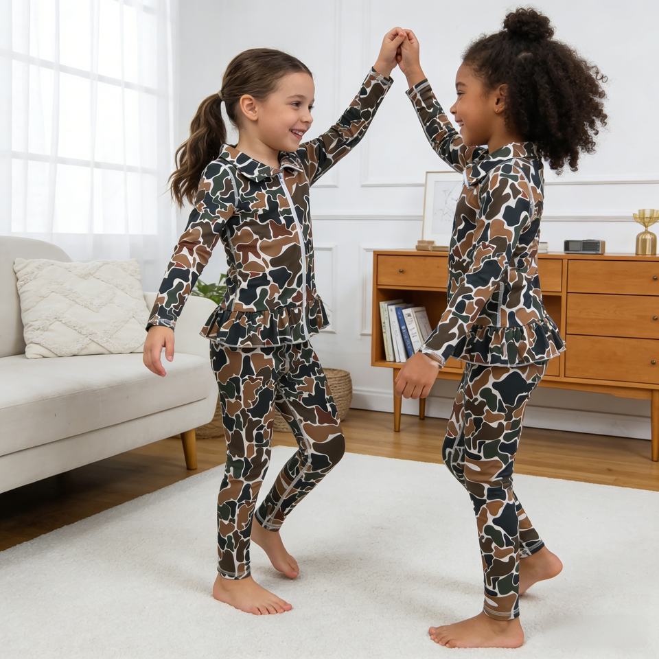 ชุดโยคะเด็กผู้หญิงลายพรางสีน้ำตาลสไตล์ตะวันตก GLP2992 rts สำหรับฤดูใบไม้ร่วง ขายส่ง เสื้อแขนยาว ชุดซิป